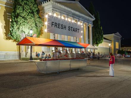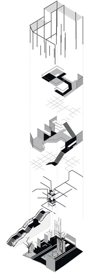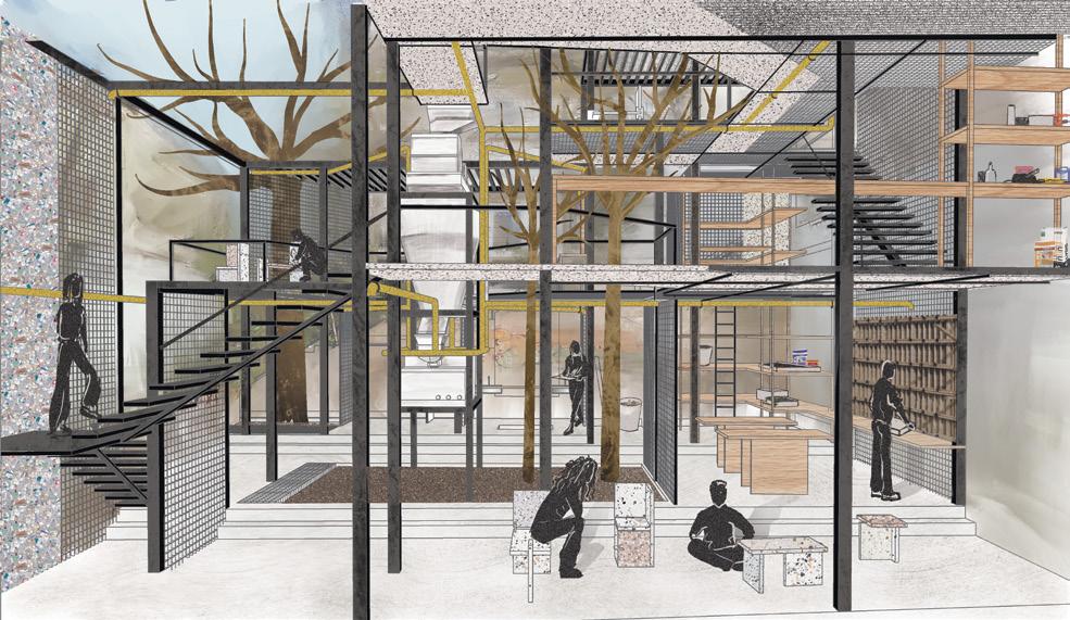 πε ρικλείει όλη τη κατασκευή, έχοντας απολήξεις σε επιλεγμένες κάθετες και οριζόντιες επιφάνει ες. Απόβλητα συλλέγονται, καθαρίζονται, ταξινομούνται και στη συνέχεια με τη βοήθεια του χρήστη-τεχνίτη-κατασκευαστή, τοποθετούνται μέσα στο μηχανισμό. Εκεί θρυματίζονται, ανα μειγνείονται με μπετόν και στη συνέχεια διοχετεύονται στην επιλεγμένη κτηριακή επιφάνεια. Με αυτόν τον τρόπο, σταδιακά ‘εκτυπώνεται’ μία τρισδιάστατη πλατεία, ένα labour palace, ένα αέναο εργοτάξιο που συνεχώς εξελίσσεται μέσω της συμμετοχής, δίνοντας έμφαση τόσο στο προσωπικό όσο και στο συλλογικό αποτύπωμα. Η εργασία/μόχθος αποκτά νέες διαστάσεις, και επιχειρείται η σύνδεση της τόσο με τη διασκέδαση όσο και με τις έννοιες της κοινωνικοποίησης και της αύξησης της συλλογικής συνείδησης.