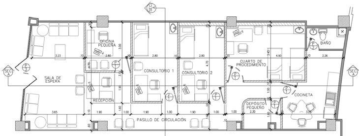 Pasillo de circulación: Un espacio abierto que conecta las diferentes áreas del consultorio, permitiendo el flujo eficiente de pacientes y personal.
