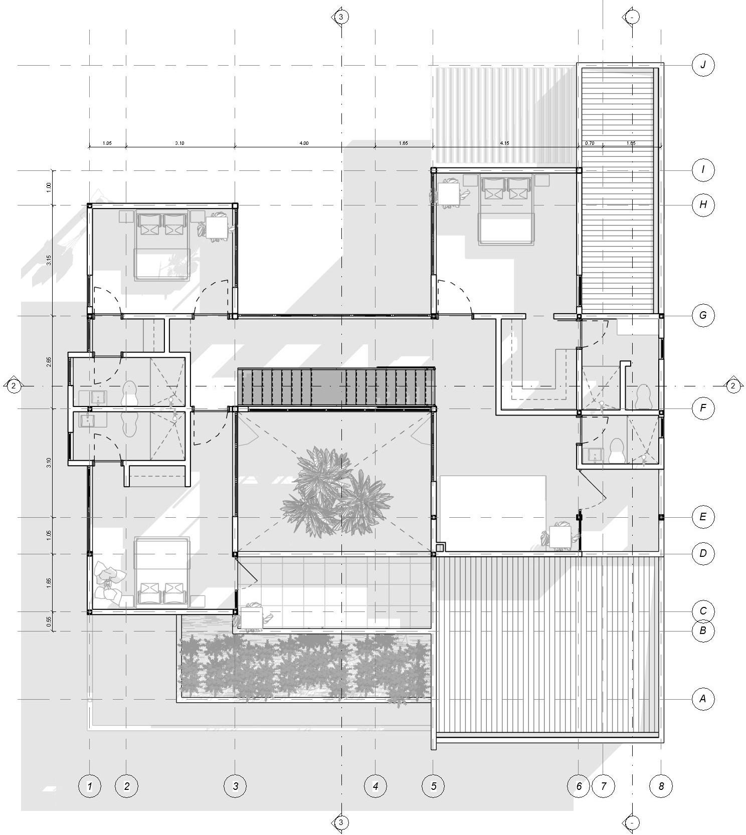 Segundo nivel (100): Ofrece cinco habitaciones, cada una con su pro- pio baño, sala y dos terrazas.