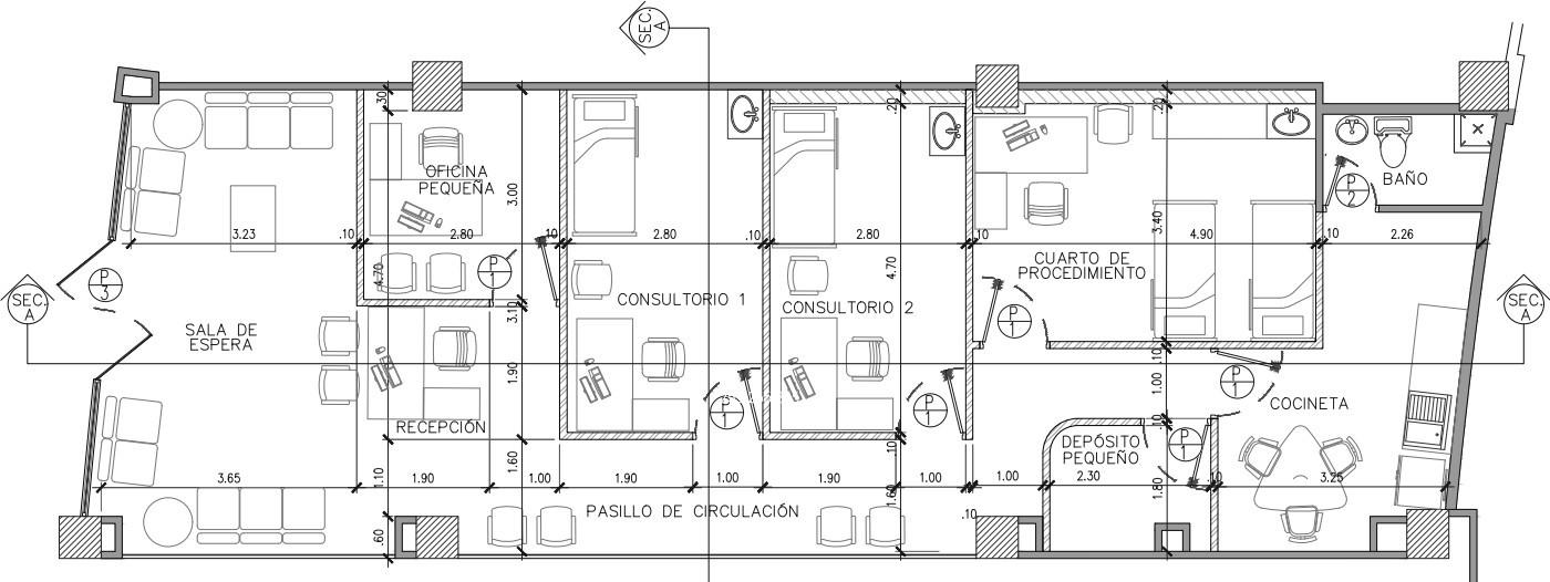 Pasillo de circulación: Un espacio abierto que conecta las diferentes áreas del consultorio, permitiendo el flujo eficiente de pacientes y personal.