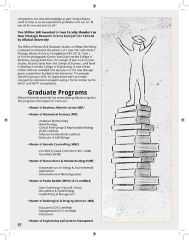 Two Million SAR Awarded to Four Faculty Members in New Strategic Research Grants Competition Funded by Alfaisal University The Office of Research & Graduate Studies at Alfaisal University is pleased to announce the winners of a new internally funded Strategic Research Grants Competition (SRG 2015). From L to R in the photograph: Garwin Kim Sing from the College of Medicine, George Kulik from the College of Science & General Studies, Ricardo Santa from the College of Business, and Tarek H. Mokhtar from the College of Engineering. A total of two million SAR was awarded over two years in this new strategic grants competition funded by the University. The projects started in January 2015. All applications were externally reviewed by international experts using a format similar to the KACST and NSTIP competitions.