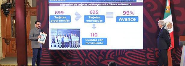 Explicó que el pasado 4 de junio comenzó la distribución de la tarjeta del programa La Clínica es Nuestra, instrumento con el cual se dispersan los recursos económicos a cada uno de los 11 mil 692 centros de salud con cuenta activa. Del total de tarjetas programadas, a la fecha se han entregado 11 mil 112.