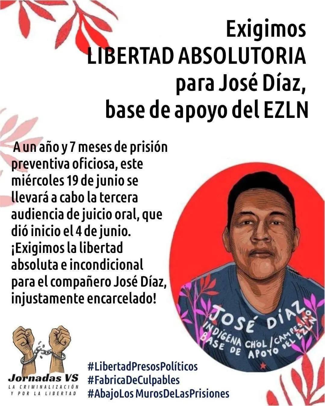La audiencia judicial para José Díaz Gómez, miembro de las bases de apoyo del Ejército Zapatista de Liberación Nacional (EZLN), fue nuevamente pospuesta, exacerbando las preocupaciones sobre el acceso a la justicia para el detenido. Díaz Gómez lleva más de un año y medio detenido bajo prisión preventiva por acusaciones de robo con violencia, en lo que sus defensores denuncian como un arresto arbitrario marcado por condiciones inhumanas.