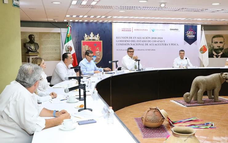 El gobernador Rutilio Escandón Cadenas y el titular de la Comisión Nacional de Acuacultura y Pesca (Conapesca), Octavio Almada Palafox, encabezaron la reunión de evaluación de acciones en materia pesquera que los gobiernos de México y de Chiapas han impulsado en el periodo 2018-2024, las cuales han permitido fortalecer la cadena productiva y elevar la comercialización y la economía rural, para consolidar al estado como líder en esta actividad y seguir garantizando la seguridad agroalimentaria en la entidad y el país.