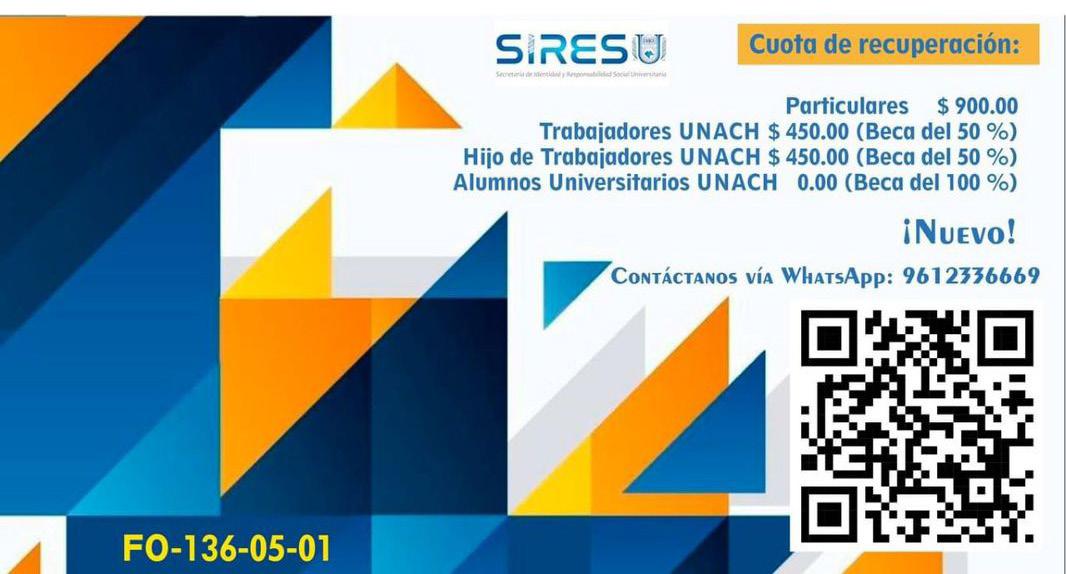 La cuota de recuperación para formar parte de los talleres citados es de 900 pesos para particulares, mientras que los trabajadores o sus hijos, deberán cubrir un costo de 450 pesos, en el caso de los estudiantes de distintos programas académicos de la UNACH, su inscripción será gratuita. Para mayores informes, los interesados pueden dirigirse a la página www.siresu.unach.mx/talleres, comunicarse al número 961 233 6669 o dirigirse a las oficinas de la SIRESU, ubicadas en la Calle 4ª. Poniente Sur #171ª, entre Avenida Central y 1ª Sur. Colonia Centro.