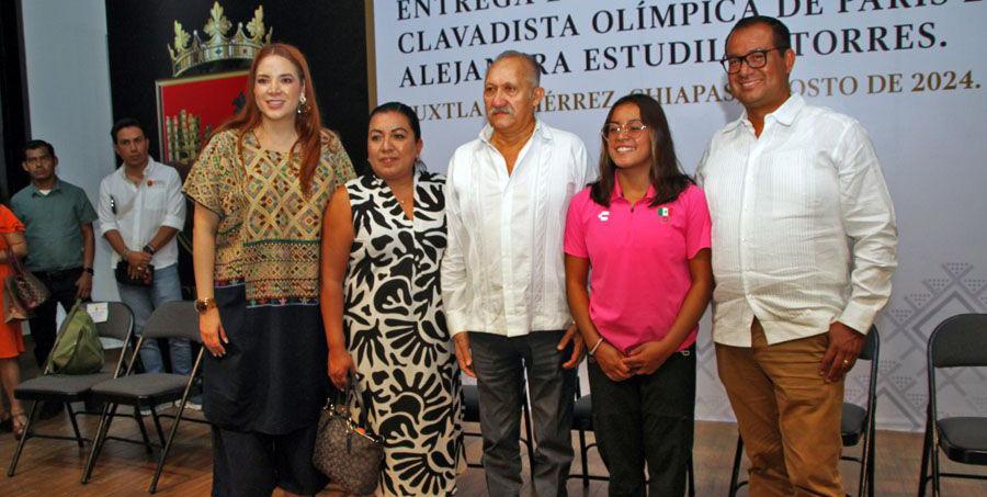 La clavadista olímpica Alejandra Estudillo Torres, convivió este miércoles con alrededor de 150 atletas, entrenadores y padres de familia, en las instalaciones del Instituto del Deporte del estado de Chiapas, en el marco del reconocimiento que le otorgó el Gobierno de Chiapas por su participación en los Juegos Olímpicos Paris 2024. Previo y posterior al reconocimiento, la clavadista platicó con la directora del Indeporte, Tania Robles Velázquez, quien la felicitó por este gran logro, así como ponerla como ejemplo para las y los atletas de Chiapas; además de reconocer que este trabajo es de toda la familia, quienes precisamente la acompañaron.