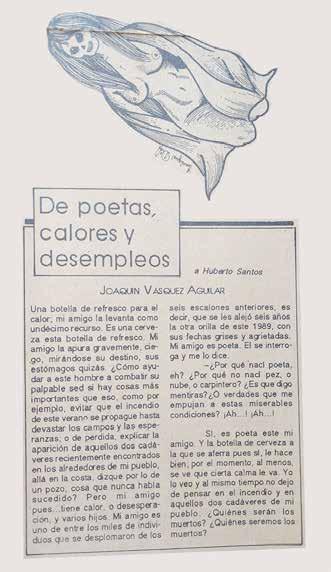 na botella de refresco para el calor; mi amigo la levanta como undécimo recurso. Es una cerveza esta botella de refresco. Mi amigo la apura gravemente, ciego, mirándose su destino, sus estómagos quizás. ¿Cómo ayudar a este hombre a combatir su palpable sed si hay cosas más importantes que eso, como por ejemplo, evitar que el incendio de este verano se propague hasta devastar los campos y las esperanzas; o de perdida, explicar la aparición de aquellos dos cadáveres recientemente encontrados en los alrededores de mi pueblo, allá en la costa, dizque por lo de un pozo, cosa que nunca habla sucedido? Pero mi amigo pues...tiene calor, o desesperación, y varios hijos. Mi amigo es uno de entre los miles de individuos que se desplomaron de los seis escalones anteriores, es decir, que se les alejó seis años la otra orilla de este 1989, con sus fechas grises y agrietadas. Mi amigo es poeta. Él se interroga y me lo dice.