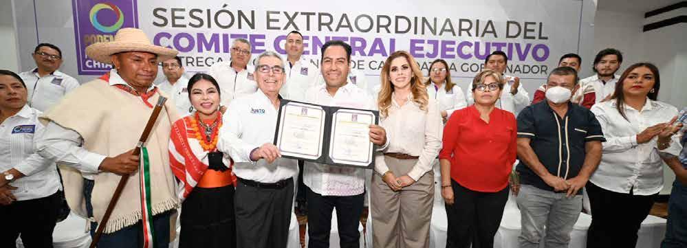Durante la sesión extraordinaria del Comité Central Ejecutivo del partido Podemos Mover a Chiapas, el senador con licencia, Eduardo Ramírez Aguilar, recibió la constancia que lo acredita como candidato a la gubernatura del estado de este instituto político.