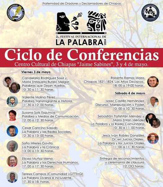 El Centro Cultural Jaime Sabines en Tuxtla Gutiérrez, Chiapas, será sede del ciclo de conferencias dentro del 2° Festival Internacional de la Palabra “Voces de Primavera” los días 3 y 4 de mayo de 2024, a partir de las 10 de la mañana.