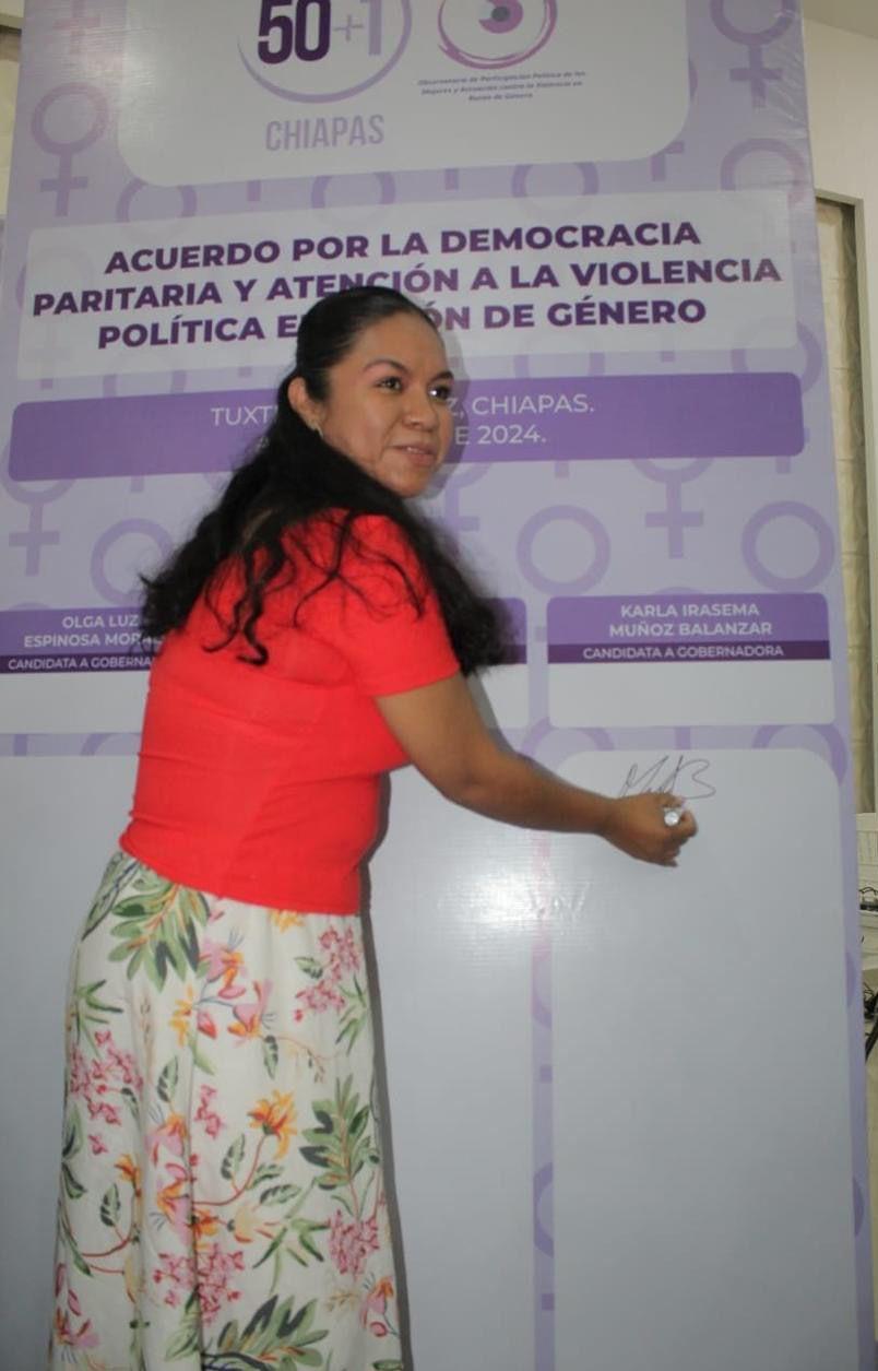 El documento signado por la candidata de Movimiento Ciudadano, Karla Irasema Muñoz Balanzar; la candidata de la alianza Fuerza y Corazón por Chiapas, Olga Luz Espinosa Morales; y el candidato de la coalición Sigamos haciendo Historia, Oscar Eduardo Ramírez Aguilar, señala que una verdadera democracia participativa bajo el principio de legitimidad democrática, exige el impulso de liderazgos y una participación plena de las mujeres, al amparo del principio constitucional de paridad de género.