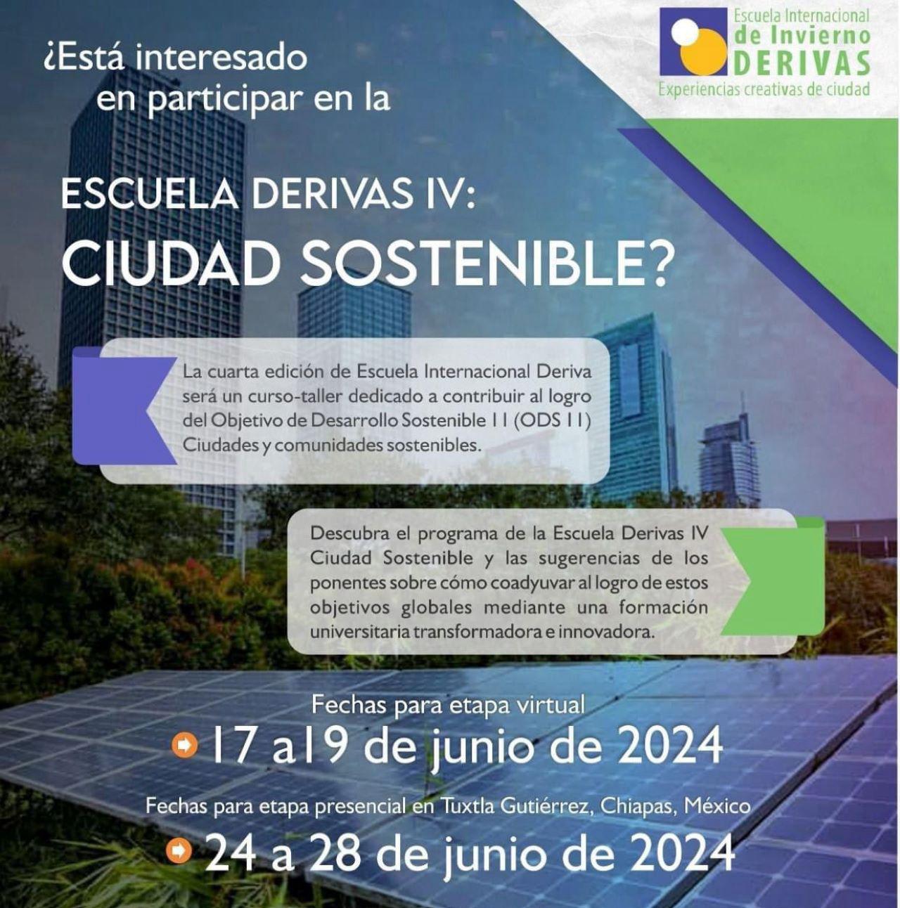 Tuxtla Gutiérrez, Chis., 28 MAY.La Universidad Autónoma de Chiapas a través de la Coordinación General de Relaciones Interinstitucionales, invita a sus estudiantes a formar parte de la 4ª Edición de Escuela Internacional Derivas IV: Experiencias Creativas de Ciudad “Ciudad Sostenible”.