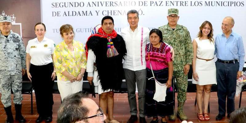 En la Conmemoración del Segundo Aniversario de Paz entre los municipios de Aldama y Chenalhó, el gobernador Rutilio Escandón Cadenas reconoció la voluntad de diálogo y disposición de los gobiernos y las autoridades tradicionales para alcanzar este pacto de paz, amor, fraternidad y bien común, que constituye, dijo, el mayor tesoro que se va a heredar a las presentes y futuras generaciones de ambos pueblos.