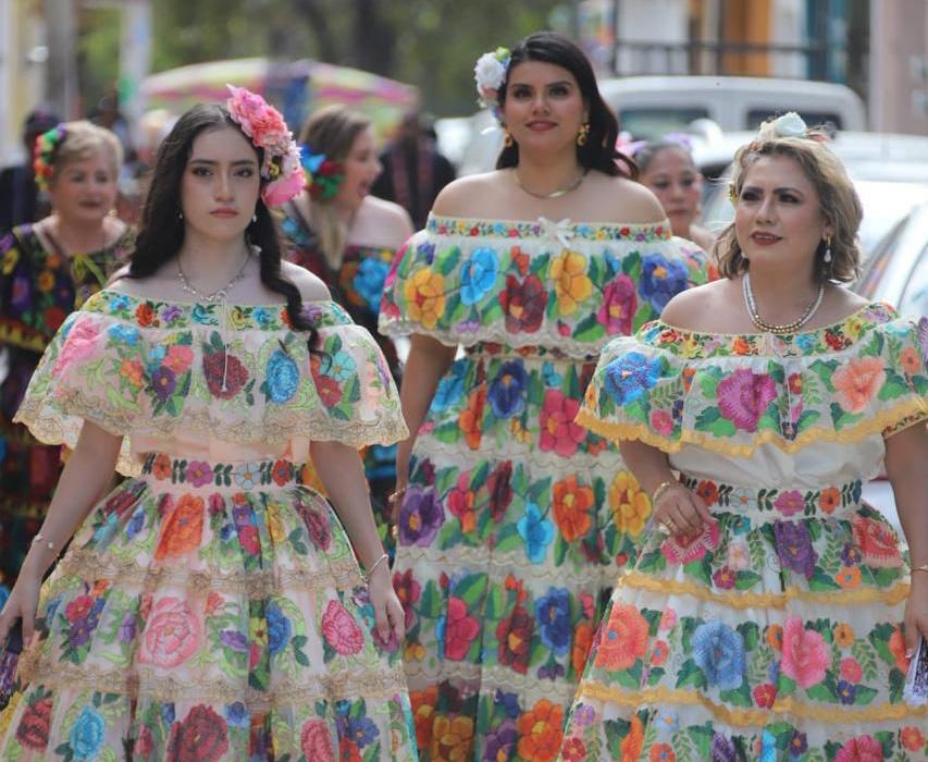 Este atuendo, compuesto por una falda bordada con hilos coloridos que simulan flores y una blusa adornada con aplicaciones bordadas, destacó como símbolo de identidad y cultura durante el evento multicolor.