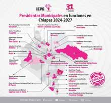 En los Procesos Electorales Locales 2024 resultaron electas 1564 personas, de las cuales 872 son mujeres, el equivalente al 55.75%, quienes actualmente se encuentran en ejercicio de su cargo, en su mayoría desde los Ayuntamientos, que son espacios con responsabilidad colectiva cuando se constituyen en cabildo; contexto que conlleva una mayor relevancia en el respeto al ejercicio de la función pública de las mujeres, pues, a pesar de los avances en la materia, la brecha de género es persistente y palpable, situación que se recrudece aún más en Chiapas, en donde, actualmente, solamente 24 Ayuntamientos son encabezados por mujeres (22 Presidentas por elección popular y 2 nombradas por el H. Congreso del Estado en los Ayuntamientos de Frontera Comalapa y Bella Vista).