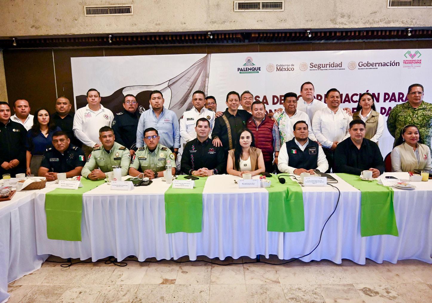 En el municipio de Palenque, el Fiscal General del Estado, Jorge Luis Llaven Abarca, y el Secretario de Seguridad del Pueblo, Óscar Alberto Aparicio Avendaño, encabezaron la Mesa de Seguridad Regional, donde estuvieron presentes las y los alcaldes de la zona Selva.