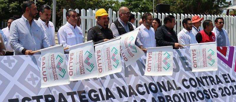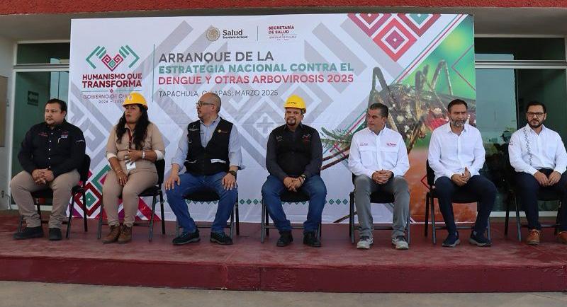 Tapachula, Chiapas; 31 de marzo de 2025.- El secretario de Salud de Chiapas, Omar Gómez Cruz, y el director de Enfermedades Transmitidas por Vector del Centro Nacional de Prevención y Control de Enfermedades (Cenaprece), Fabián Correa Morales, dieron inicio a la Estrategia Nacional contra el Dengue y otras Arbovirosis en el municipio de Tapachula, que consiste en intensificar las acciones integrales previo al periodo vacacional de Semana Santa y a la temporada de lluvias, que es cuando incrementa la presencia del mosco transmisor, para evitar un repunte de casos.