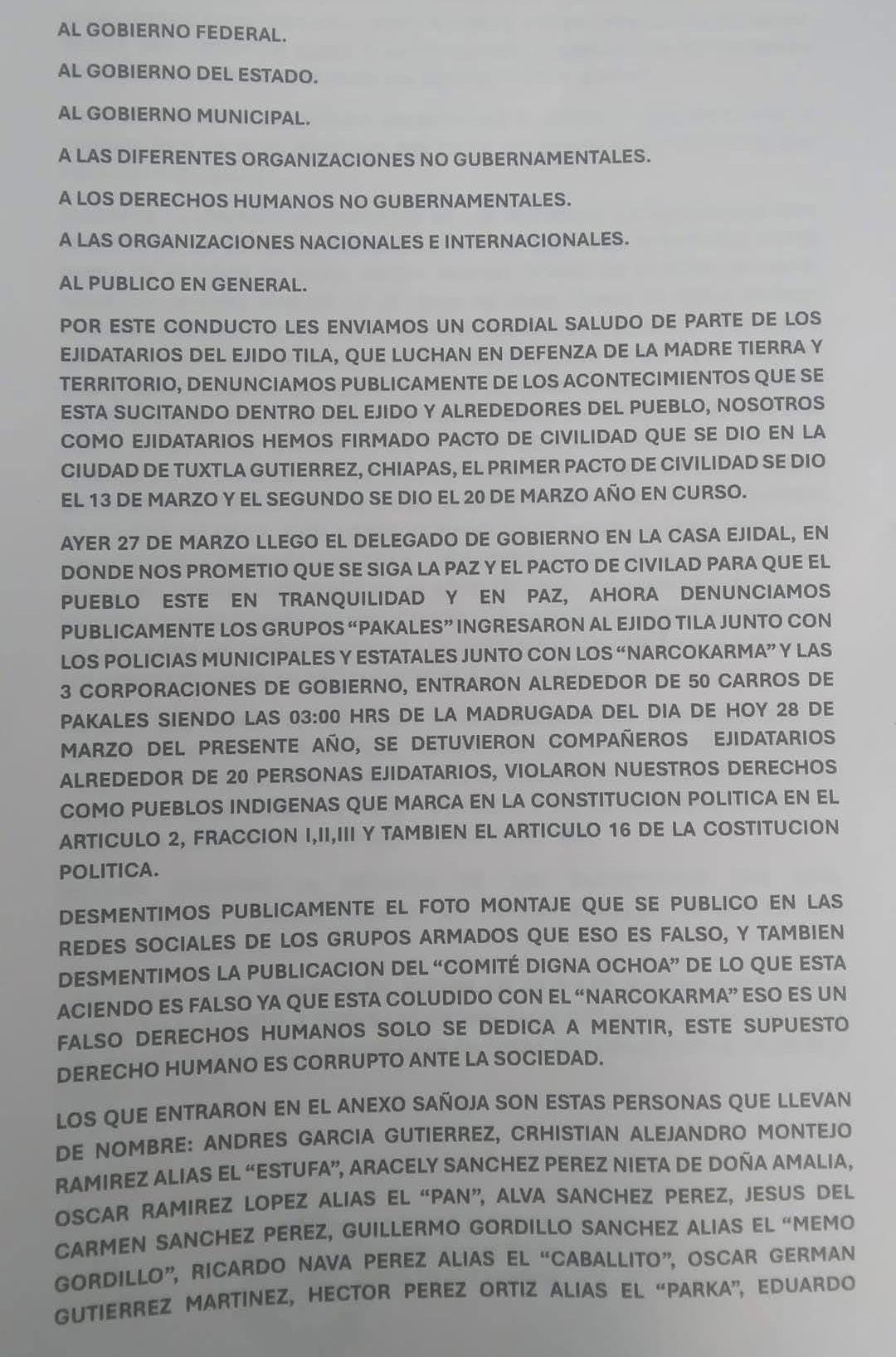 La problemática en Tila terminó por estallar en 2015 luego de que un nutrido grupo de ejidatarios indígenas decidiera tomar por la fuerza el ayuntamiento para asumir el control de las tierras, incluida la cabecera municipal, que, aseguran, fueron arrebatas de manera ilegal hace más de 50 años.