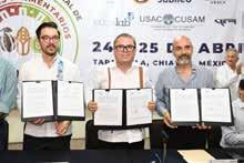 Tapachula, Chiapas. - En el marco del Primer Simposio Internacional de Sistemas Alimentarios Mesoamericanos, organizado por la Escuela de Sistemas Alimentarios, Campus IV, el rector Oswaldo Chacón Rojas firmó convenios con los representantes del laboratorio EUCELAB y la organización Heifer Internacional, Alejandro España de la Cuesta y Gustavo Adolfo Maldonado Venegas, respectivamente.