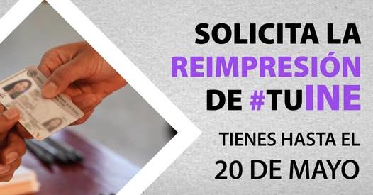 El Instituto Nacional Electoral (INE) en Chiapas informa que el próximo 20 de mayo concluye el plazo para solicitar la reimpresión por robo o extravío de la Credencial para Votar.