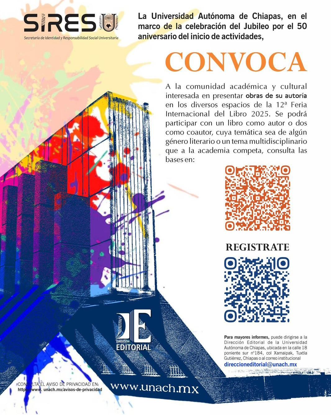 rán haber sido publicada durante el segundo semestre de 2024 y hasta el cierre de la presente convocatoria, contar con registro legal ISBN y, en el caso de versiones impresas, asegurar la existencia de ejemplares disponibles; para los libros electrónicos, contar con el enlace de internet al sitio donde se encuentre alojado. Una vez enviado el material, será revisado por el Comité Organizador de la FIL-UNACH, para asegurar que cumplan con los requerimientos previstos en la presente convocatoria y se realizará con base en la calidad de las obras y la disponibilidad de espacios en las sedes del evento para el que fueron llamados. Para mayores informes, las y los interesados podrán dirigirse a la página electrónica https://siresu.unach.mx/, enviar un correo a la dirección direccioneditorial@ unach.mx o dirigirse directamente a las oficinas de la Dirección Editorial UNACH, ubicada en la 18 poniente sur número 184, en la colonia Xamaipak de Tuxtla Gutiérrez.