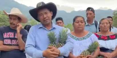 mente al gobernador del estado, a quien los campesinos le reclamaron el intento de despojarlos de sus parcelas sin ofrecer alternativas ni reconocimiento. “Yo no recibo ni un crédito, ni apoyo de programas como Sembrando Vida. Pero ahora sí vienen a quitarme mi pedazo de terreno, que trabajo con mi esposa, con abono orgánico y sudor”, denunció un productor de piña.