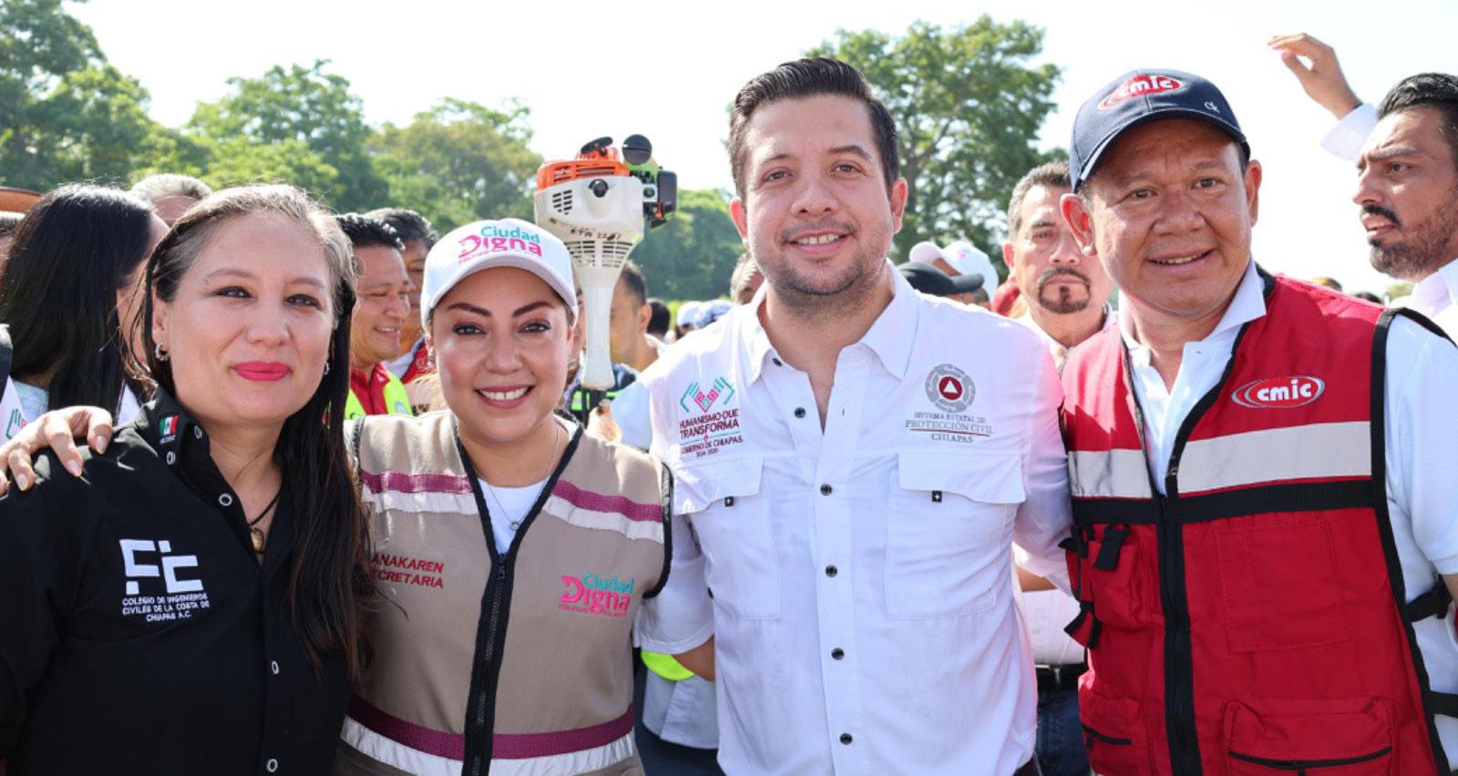 Tapachula, Chiapas.- Atendiendo las instrucciones del gobernador Eduardo Ramírez Aguilar, la titular de la Secretaría de Infraestructura, Anakaren Gómez Zuart, junto al presidente municipal de Tapachula, Yamil Melgar Bravo, el secretario de Protección Civil, Mauricio Cordero Rodríguez, la oficial mayor, Viridiana Figueroa García, representantes de la iniciativa privada en la región, así como ciudadanas y ciudadanos, dieron el banderazo de inicio a la jornada de limpieza “Ciudad Digna” en la Perla Soconusco.
