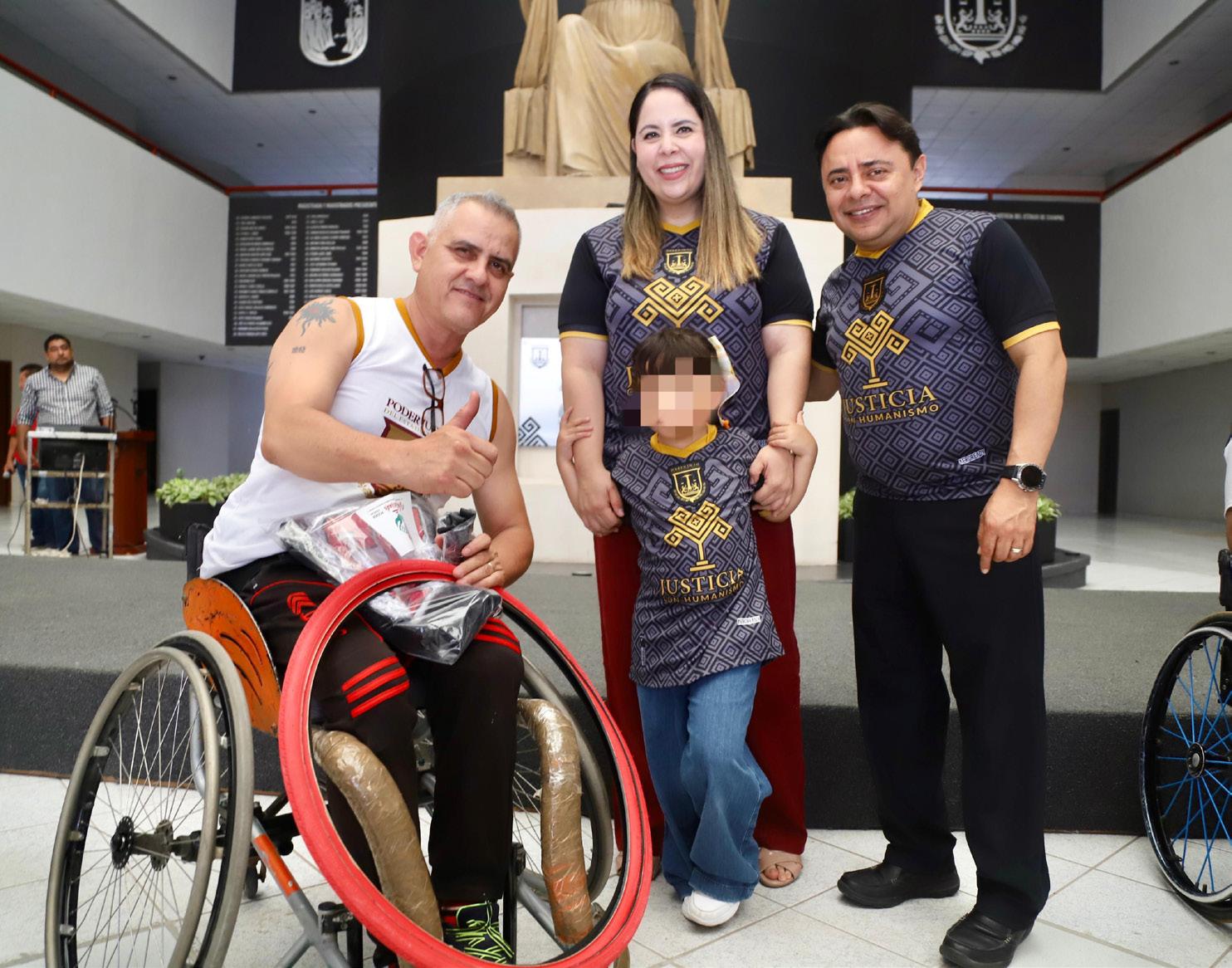 Durante el acto se entregaron uniformes para el equipo de básquetbol sobre ruedas, incluyendo aditamentos especiales para sus sillas, así como uniformes para el equipo de fútbol soccer.