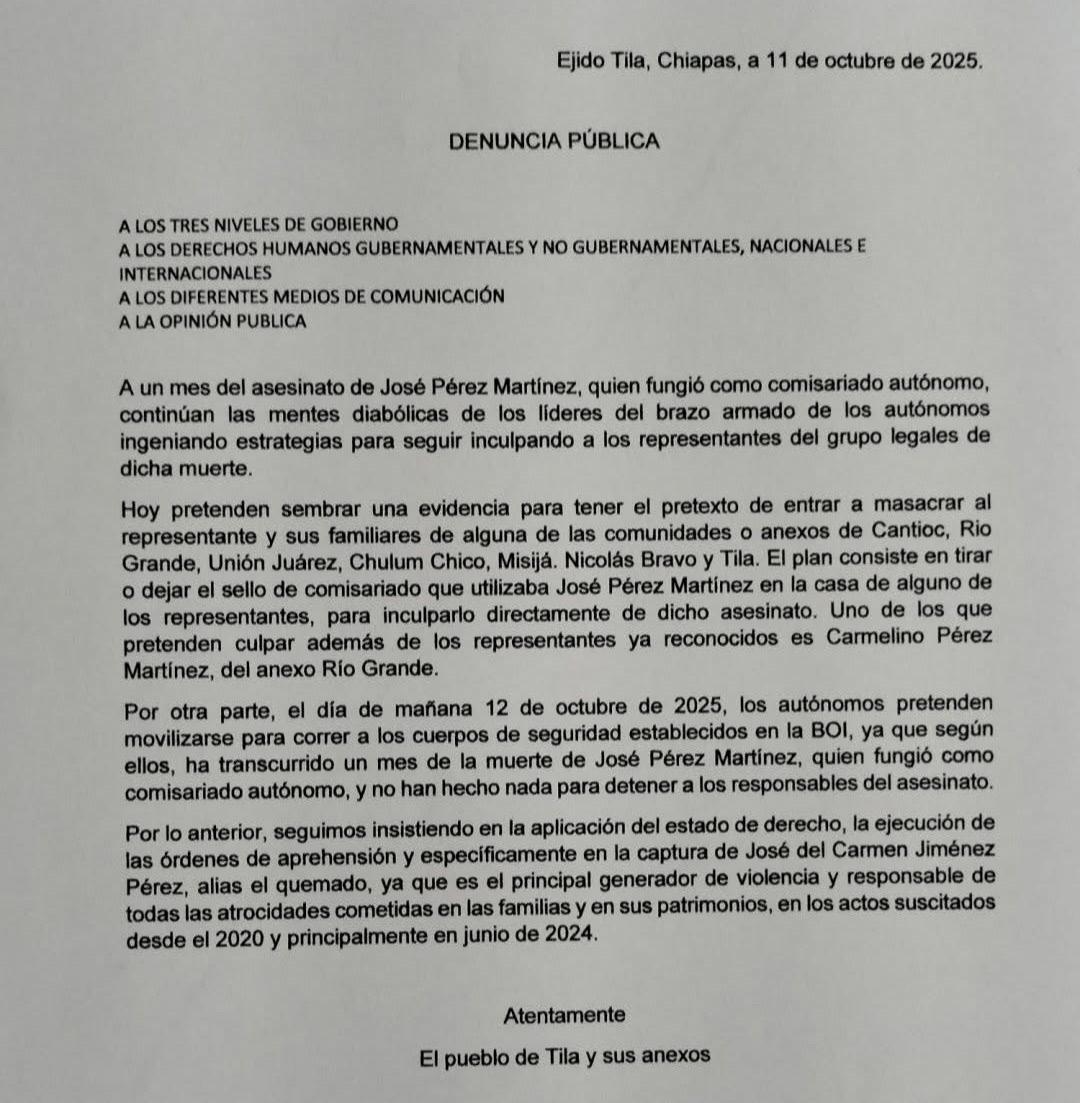 En el documento, las organizaciones afirmaron que desde abril de este año se han documentado incursiones, destrucción de letreros, mediciones de tierras, robo de cosechas y quema de casas, acciones en las que habrían participado policías municipales de Ocosingo, elementos del Ejército Mexicano, fuerzas estatales y personal de la Fiscalía General del Estado. Los denunciantes consideraron que esta intervención busca “legalizar el despojo” de tierras recuperadas por los zapatistas en 1994 y “orillar al EZLN a responder por vías que justifiquen una represión mayor”.