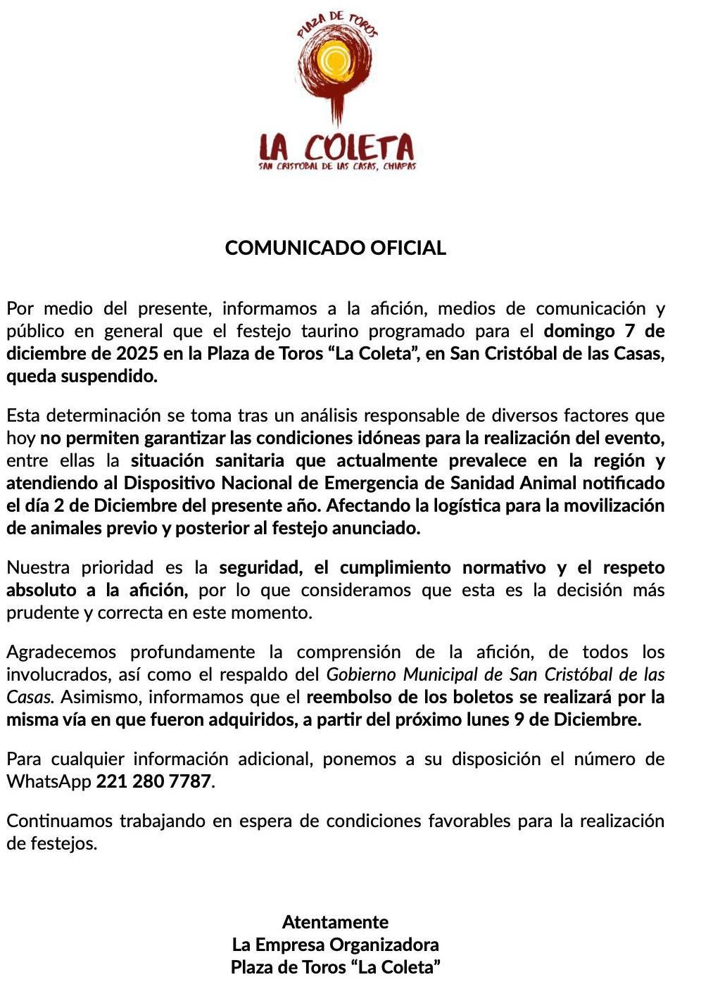 La empresa organizadora “Plaza de toros La Coleta” anunció la suspensión del festejo taurino programado para el domingo 7 de diciembre de 2025 en San Cristóbal de Las Casas. En un comunicado la organización informó que la decisión se tomó tras un análisis de diversos factores que impiden ga-