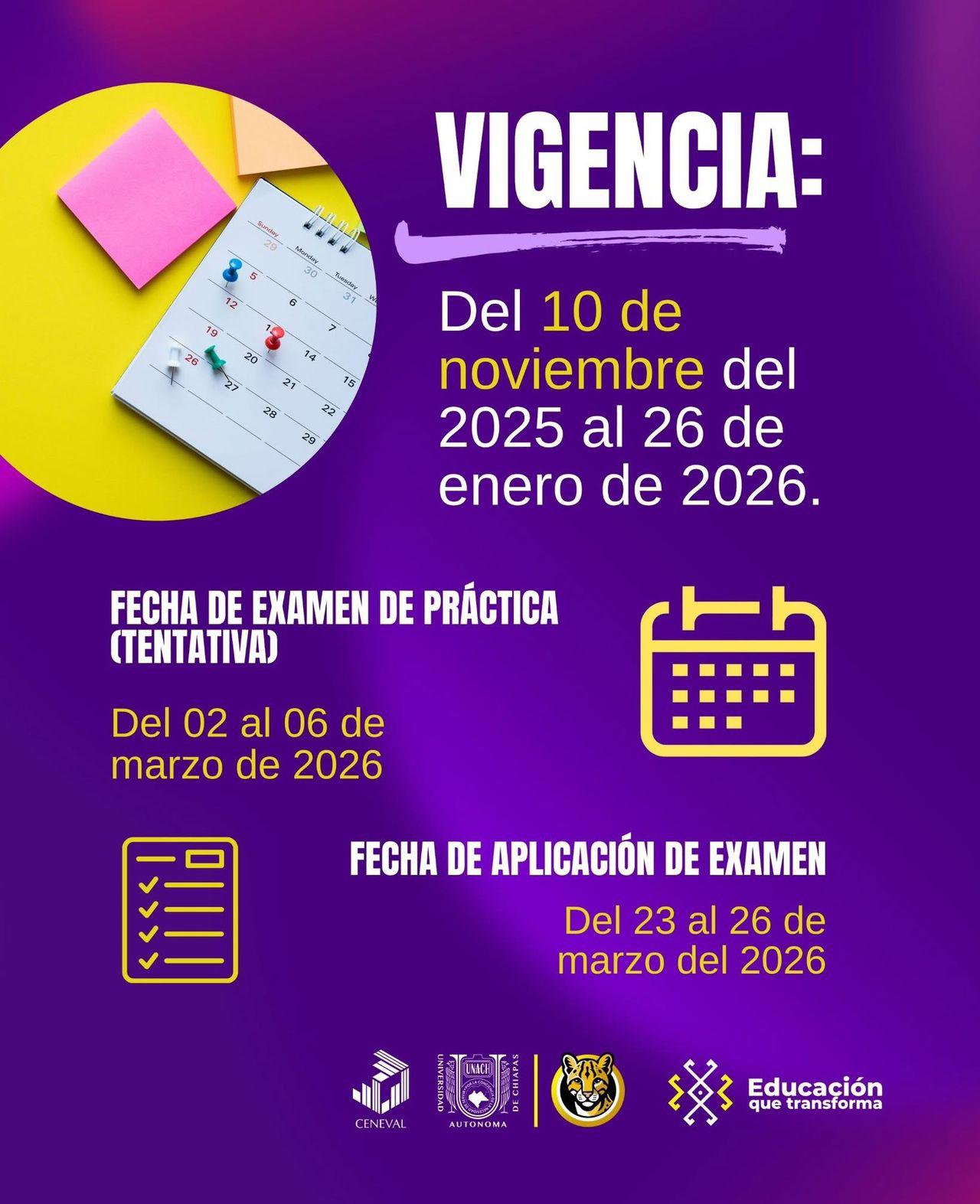 Quienes tengan interés podrán registrarse a partir de la publicación de esta convocatoria y hasta el próximo 26 de enero del 2026; el examen se aplicará del 23 al 26 de marzo y los resultados son entregados por el CENEVAL el 27 de abril de 2026.