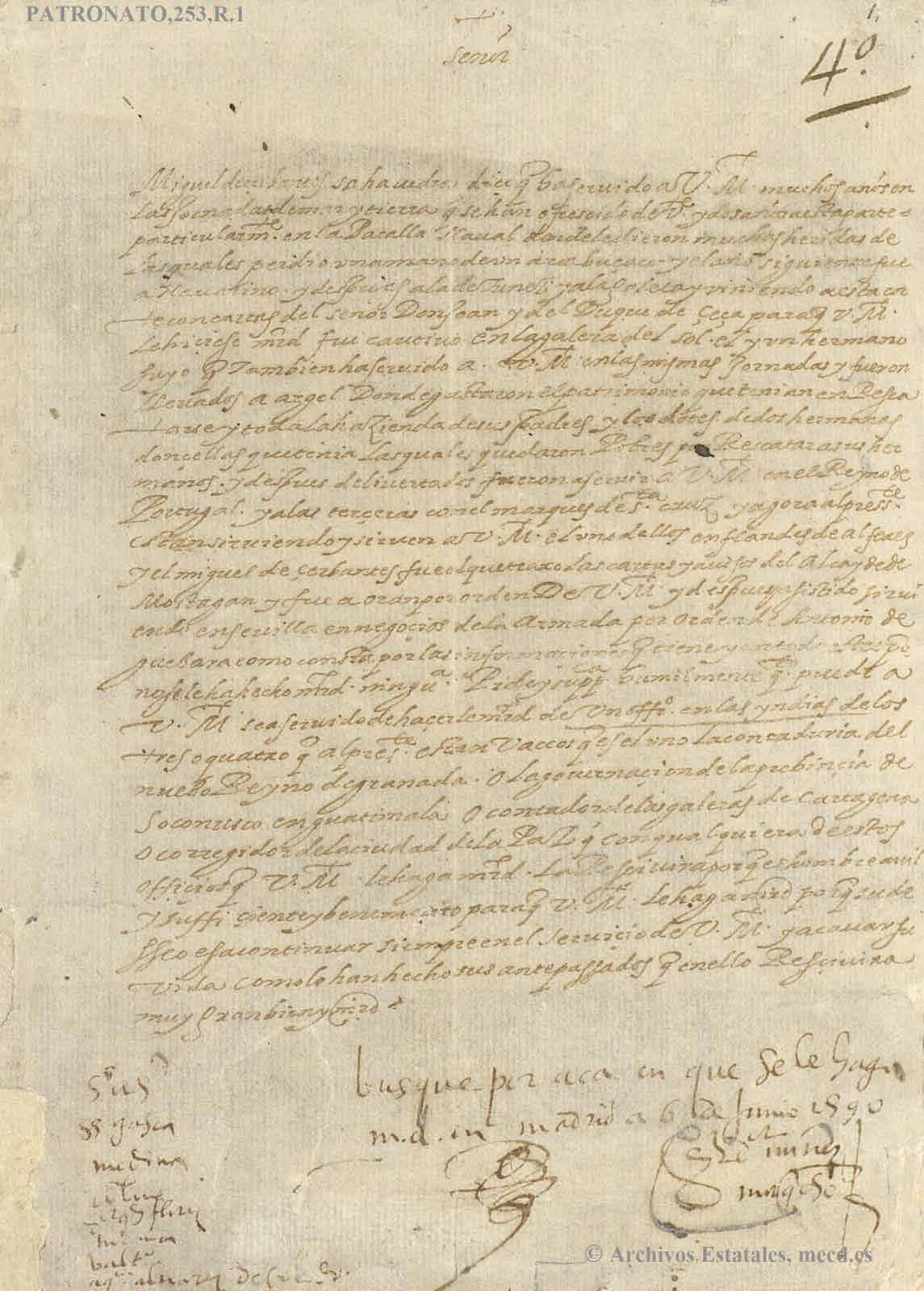 [Miguel de Cervantes] Pide e suplica humildemente, quanto puede a V. M., sea servido de hacerle merced de un oficio en las “Indias” de los tres o quatro que al presente están vacos, que es el uno la Conthaduría del nuevo Reyno de “Granada”, o la Governación de la Provincia de “Soconusco” en “Guatimala”, o Conthador de las Galeras de“Cartagena”, o Corregidor de la Cibdad de la “Paz”; que con cualquiera de estos oficios que V. M. le haga merced, la rescebirá, porque es hombre ávil e suficiente e benemérito, para que V. M. le haga merced; porque su deseo es acontinar siempre en el servicio de V. M., e acavar su vida como lo han hecho sus antepasados, que en ello rescebirá muy gran bien a merced. —En “Madrid” a 21 de mayo de 1590. Se prueba en la misiva que Cervan-