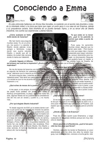 Ya que estás en tu tercer año, ¿qué te ha parecido la carrera que estás a punto de terminar? Pues guay, he aprendido muchas cosas, algunas que no sirven para nada… Pero bueno, yo creo que salgo más o menos preparada para seguir estudiando, porque claramente para trabajar, no (bromeando). Después me gustaría hacer un master, a ser posible fuera de España, de algo relacionado con el Diseño Industrial. ¿Te gustaría que la carrera se ambientase más a la parte artística o a la técnica? Creo que como está, está bien. A mi tal y como está en Valencia o en otros sitios, que es más artístico, no me hace gracia porque al final nos van a tratar más como si fuéramos diseñadores de pacotilla. Para diseñar hay que tener conocimientos sobre lo que estás haciendo, y eso lo da la parte técnica. Considero que la parte artística son cosas que puedes aprender tú por tu parte, y que una tarde te puedes poner y desarrollar tu faceta artística, pero que tú por tu cuenta no te vas a poner a estudiar álgebra. ¿Qué piensas hacer el año que viene? Si me dejan me quiero ir de Erasmus, estoy pendiente de que me digan si mi nivel de inglés es apto o no, y sino pues me quedaré aquí para hacer el Proyecto, que espero que sea lo único que me quede para el próximo año. ¿Dónde piensas ir de Erasmus? Pues de primera opción puse Dinamarca, y luego cualquiera de los países nórdicos porque son muy chachis en diseño. Ahora pasando a la Residencia, ¿qué te han parecido los tres años que llevas? Hombre, este año he tenido la Residencia un poco abandonada pero los otros dos años ha estado muy guay. Las novatadas bien, conoces a mucha gente, rela-
