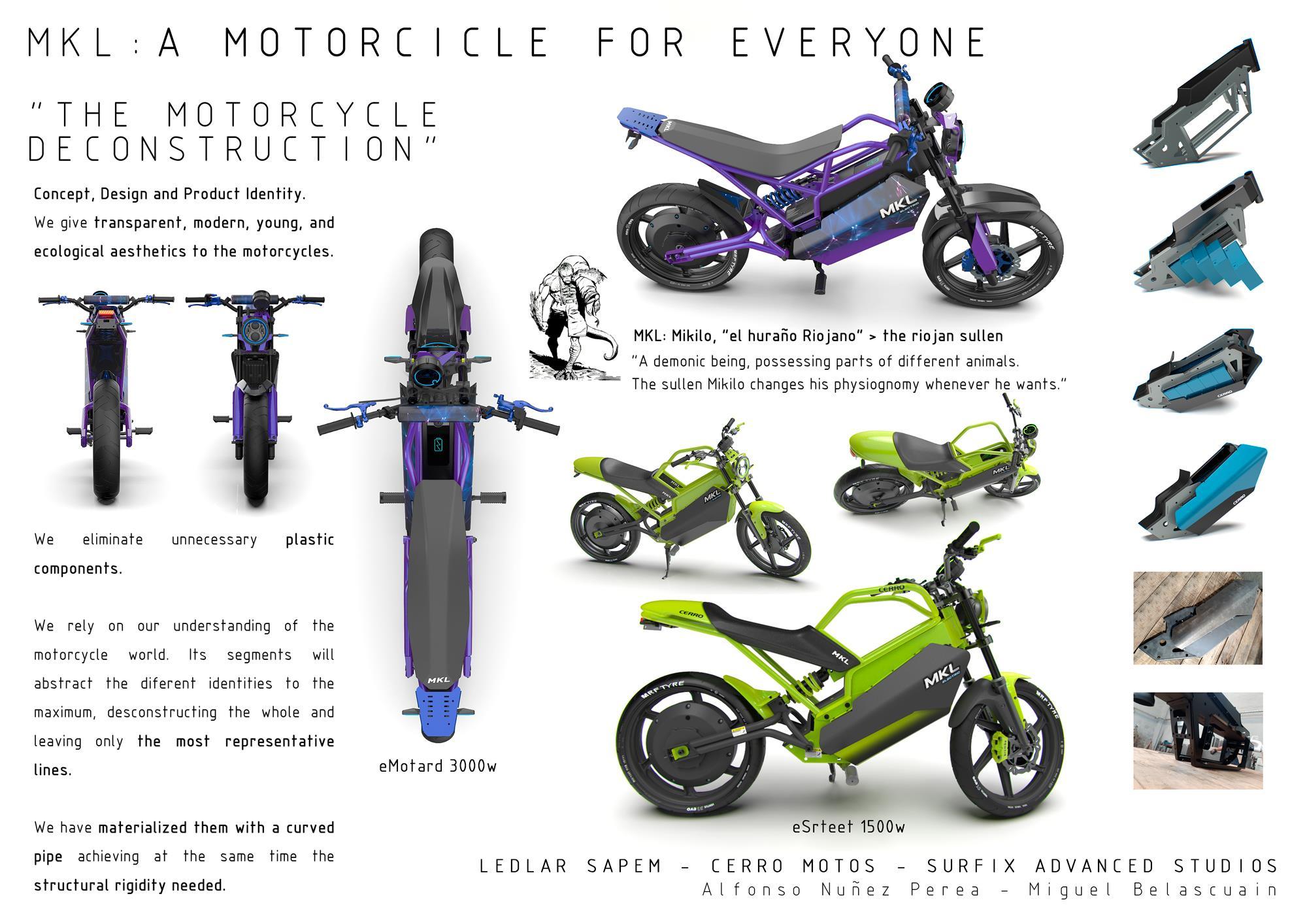 MKL is a system of 6 traditional combustion motorcycles, and the same versions in electric traction. The client was Ledlar Sapem, a state-owned company in La Rioja, whose intention was to obtain financing to manufacture a line of low-cost motorcycles aimed at social inclusion. The motorcycles share 65% of the components, the remaining 35% give them identity in the different segments.