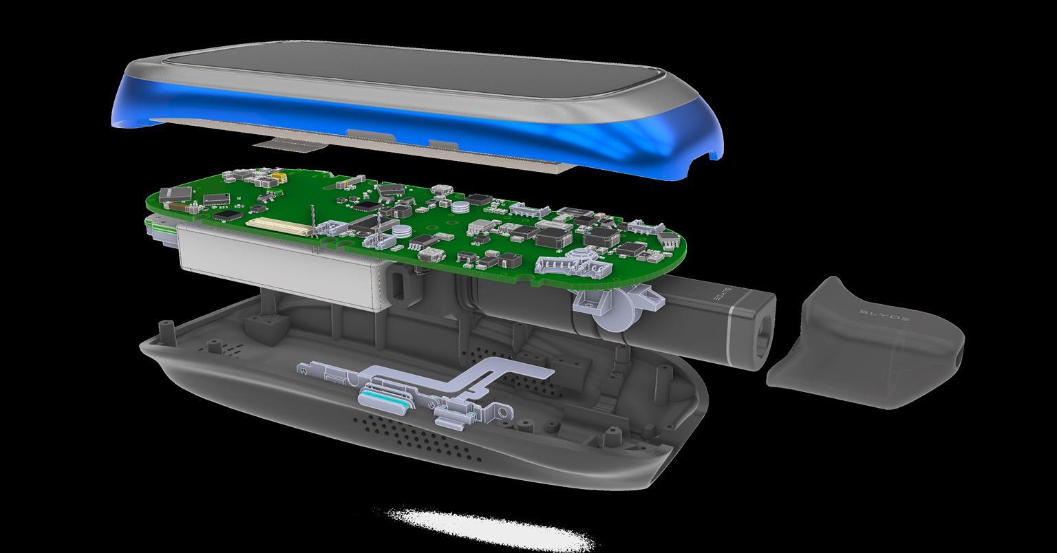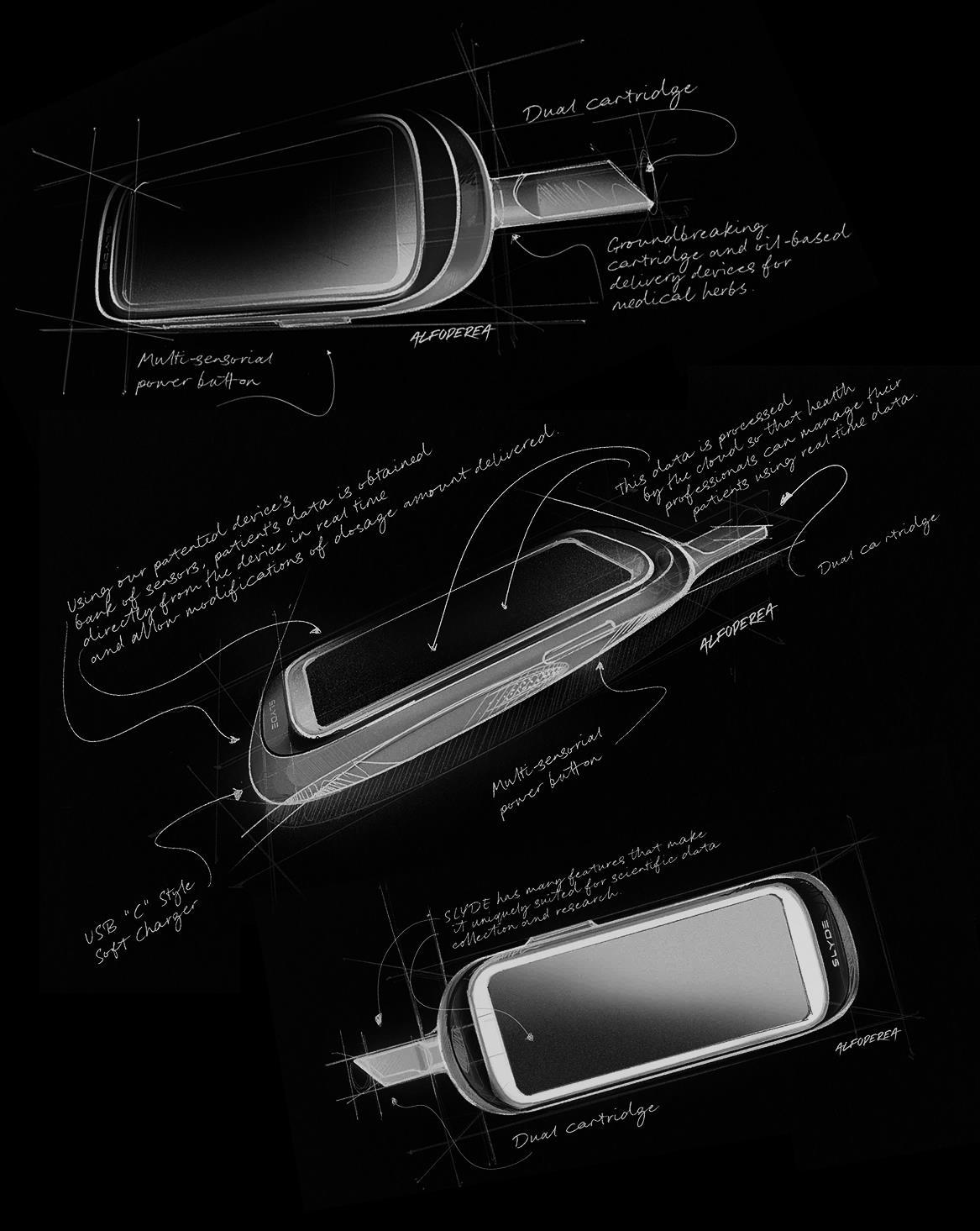 Slyde is a medical-oriented vape that combines up to 4 cartridges with different therapeutic properties. It has an interface that allows the user to regulate the proportions, flavor, and combinations of substances. It is connected to the cloud and allows doctors to keep track of the patient remotely. My task is to develop the company's identity and transfer it to the product from the shape of its howsings (SHAPE). I communicate intensively exchanging information with the Manufacturing and MKT area. Soft: PS, SolidWorks, Rhinoceros 8, others.