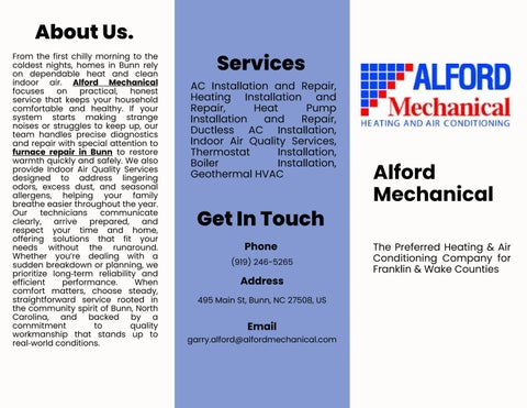 Alford Mechanical delivers reliable comfort solutions for homes and businesses throughout Bunn, North Carolina. As a local HVAC contractor, our team handles the full range of climate-control needs, starting with comprehensive HVAC service consultations that help match the right system to your space and goals. From AC Installation and Repair to Heating Installation and Repair, we work carefully to ensure dependable performance, efficient operation, and a smooth experience from start to finish. When you’re considering an upgrade, Heat Pump Installation and Repair offers year-round comfort in one efficient package, while Ductless AC Installation brings targeted cooling to rooms where extending ductwork isn’t practical. Contact Us Address: 495 Main St,Bunn,NC,27508 Phone: (919) 246-5265 Email: garry.alford@alfordmechanical.com Hours of Operation: Monday to Sunday: Hours: All Day