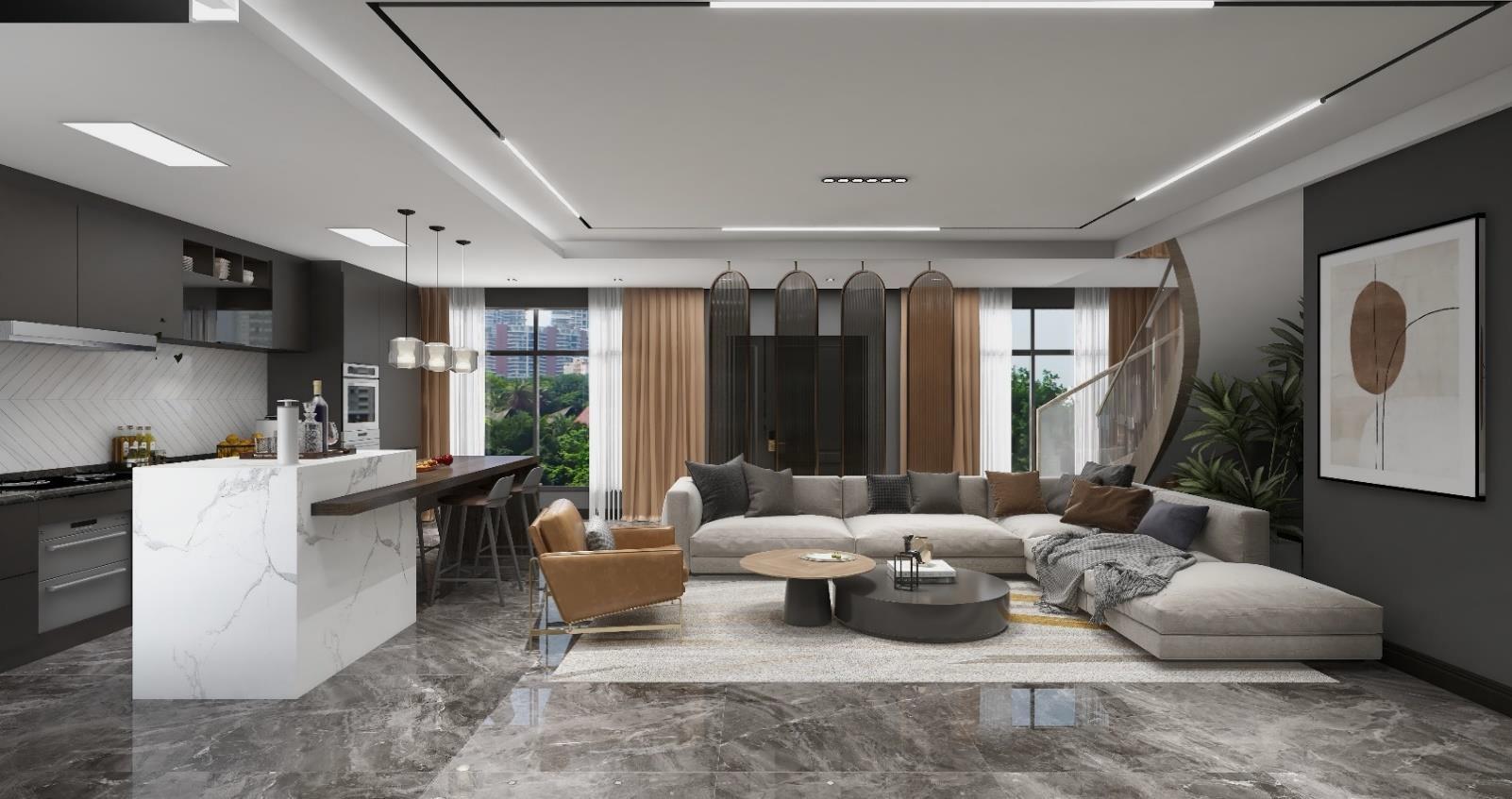 04. A mixture oflight and dark shades of marble gives the living room sleek sophistication. The characteristic colors are monochrome and natural colors showing simplicity and elegance. Full height glazing systems are used which is very modern and contemporary with spiral stairs that include two of the most beautiful and luxurious colors which are white and gold that go very well with the beiges in the furniture and makes the living