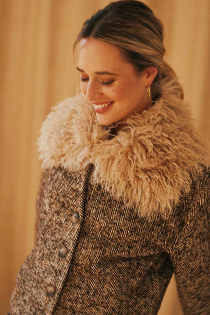 Un jersey fino bajo un chaleco de pelo, una camisa asomando bajo un punto amplio, un abrigo sobre un conjunto de texturas suaves