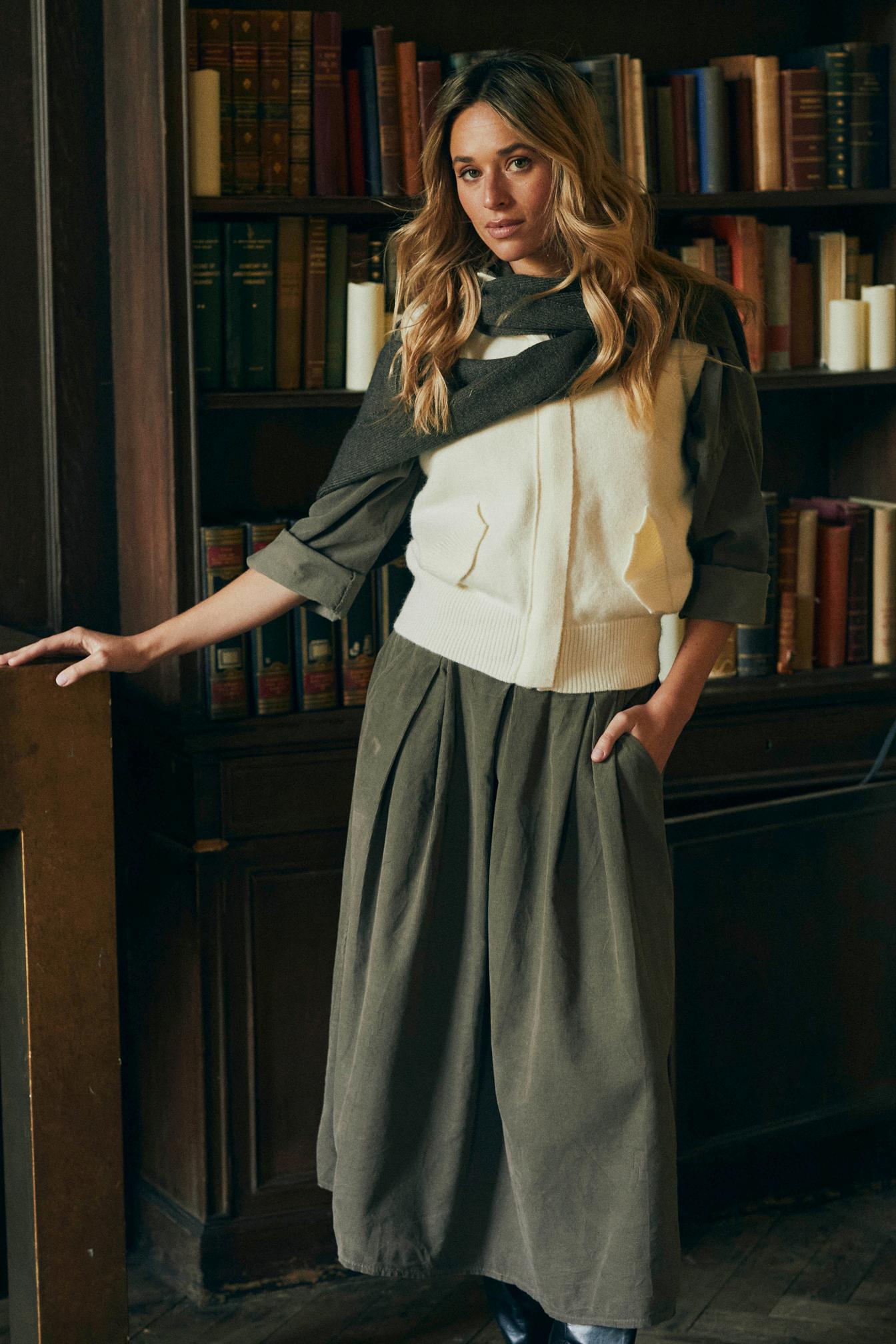 Su relieve y textura gruesa envuelven y dan estructura, sin sumar rigidez. Es el tejido perfecto para quienes buscan una prenda con atemporal, cálida y duradera