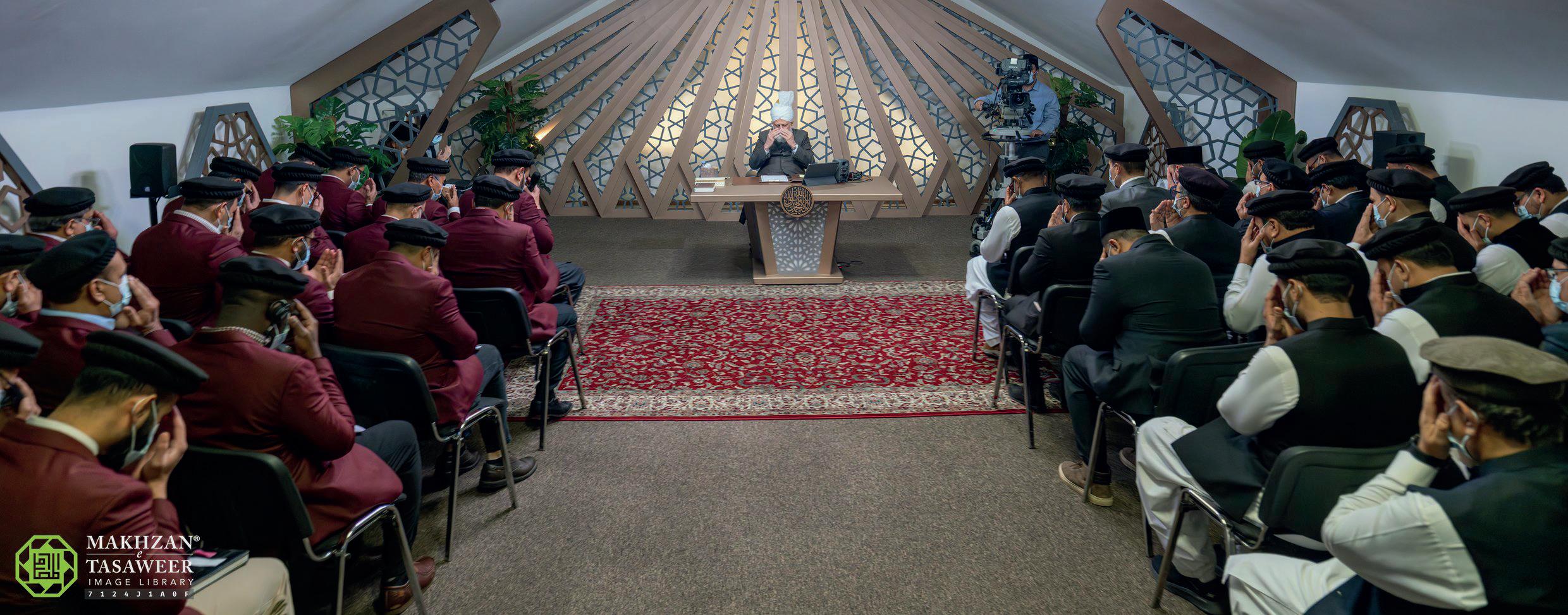 Huzooraa arrived at the MTA studio and greeted the attendees before leading everyone in a silent prayer. The seating arrangement was organised to distinguish the two delegations; the amila of Hamilton Jamaat was seated on one side, while the amila of Hamilton Mountain Jamaat was seated on the other. Huzooraa first addressed the Hamilton Jamaat, followed by the Hamilton Mountain Jamaat.