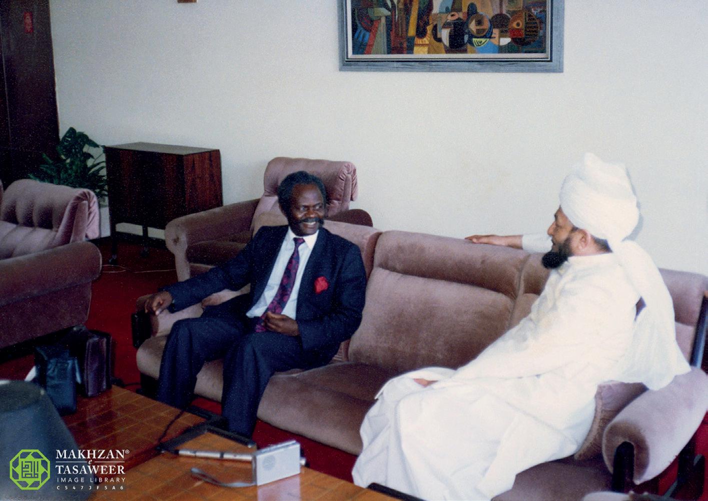Minister of Education of Uganda welcomed Hazrat Khalifatul Masih IVrh at Entebbe Airport, Uganda, 1988