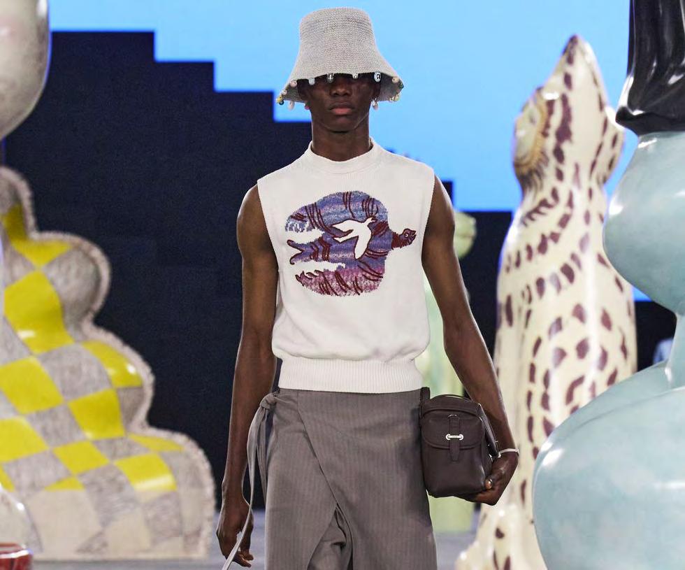 Bajar a la playa con estilo es posible siempre y cuando lo hagas con un look de la colección primavera-verano 2025 de Dior Men. La propuesta de Mr. Jones tiene todo lo necesario para bajar con estilo: desde un bonito chaleco de punto con unas palomas muy gráficas bordadas,