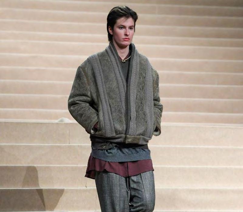 textos culturales. Uno diría que ya no le queda más vuelta de tuerca, hasta que llega Loewe y decide que todavía le quedan trucos bajo esa manga con motivo de tartán. La propuesta de la firma es sorprendente, y por ello difícil de olvidar: llevar una camisa puesta y la otra anudada a la cintura, aunque convertida en capa. Esta, se engancha al pantalón a través de la etiqueta del pantalón, que al mismo tiempo sirve de punto de unión para los pliegues de un drapeado pantalón.