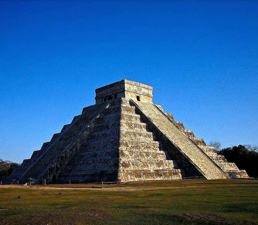 Pirámide y una plataforma adornada con una cabeza de serpiente emplumada en Chichén Itzá. Península de Yucatán, México. Se trata de una antigua ciudad mayatolteca, situada en la actual península de Yucatán. SIC explica que entre el 415 y el 435 d.C fueron hechas las primeras edificaciones que dieron inicio a lo que sería la creación de Chichén Itzá. Los itzaes conquistaron esta ciudad al final de la época del Clásico e instauraron sus propias cosas, como el culto a Kukulkán, el militarismo, elementos asociados a la cultura y tradiciones precedentes que dieron origen a lo que se conoció como maya-yucateco. Esta es una zona arqueológica que es muy reconocida por el juego que hace su pirámide, conocida como ‘El Castillo’, en cada equinoccio solar. Cada vez que el sol asciende sobre el horizonte ilumina las escalinatas, estas crean triángulos de luz y sombra que hacen parecer que van hasta la cabeza de la serpiente a los pies de la pirámide. Entre los años 1185 y 1204 esta ciudad fue conquistada por los príncipes de Mayapán quienes instauraron sus propios cultos: al Sol, la guerra y el fuego, también intervinieron en la etapa final de la construcción del El Castillo. Fue a partir del siglo XII, que comenzó el despoblamiento de Chichén Itzá.