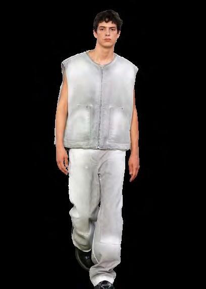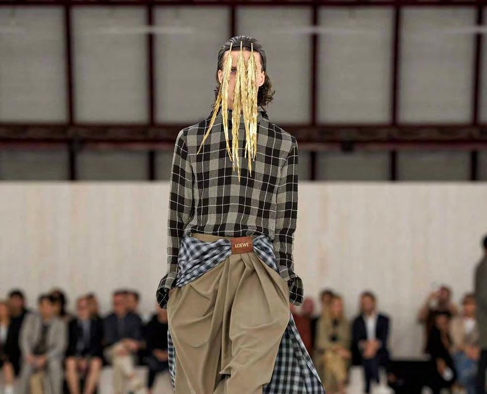 textos culturales. Uno diría que ya no le queda más vuelta de tuerca, hasta que llega Loewe y decide que todavía le quedan trucos bajo esa manga con motivo de tartán. La propuesta de la firma es sorprendente, y por ello difícil de olvidar: llevar una camisa puesta y la otra anudada a la cintura, aunque convertida en capa. Esta, se engancha al pantalón a través de la etiqueta del pantalón, que al mismo tiempo sirve de punto de unión para los pliegues de un drapeado pantalón.