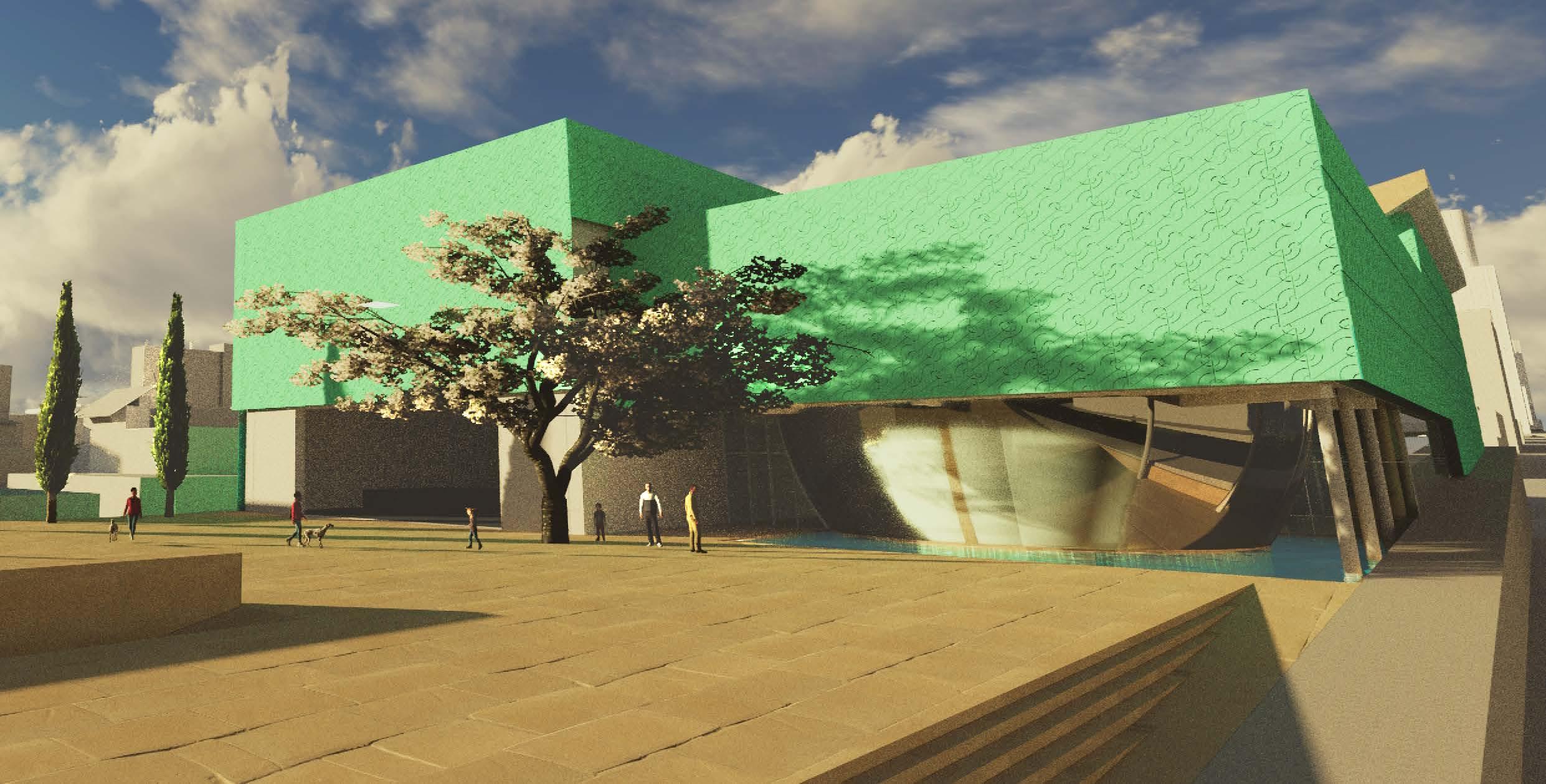 The site is cattycorner to the iconic Kansas City Star building, which is currently being proposed to be torn down to make way for a new sports stadium. In order to preserve the history of the area, the new performing arts center plans to rescue the copper panels of the Star to screen the facade. The old panels would be perforated in a pattern to allow light, which is inspired by the accoustic properties of water under vibration. Everything but the lobby would reuse panels, which would use a new copper that would patina over time as a symbol of the building settling into its new home.