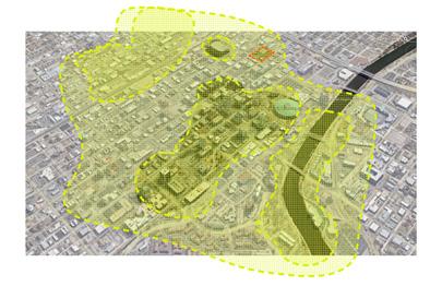 The site oriented around the southern flight takeoff and landing clearance while also responding to the urban fabric of the growing downtown. The northern picnic and garden plaza acts as a node between the arena and river areas, as well as connecting to the greater downtown on Broadway.