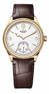 Rolex: “1908” Perpetual nella versione con cinturino in alligatore marrone e quadrante bianco. rolex.com