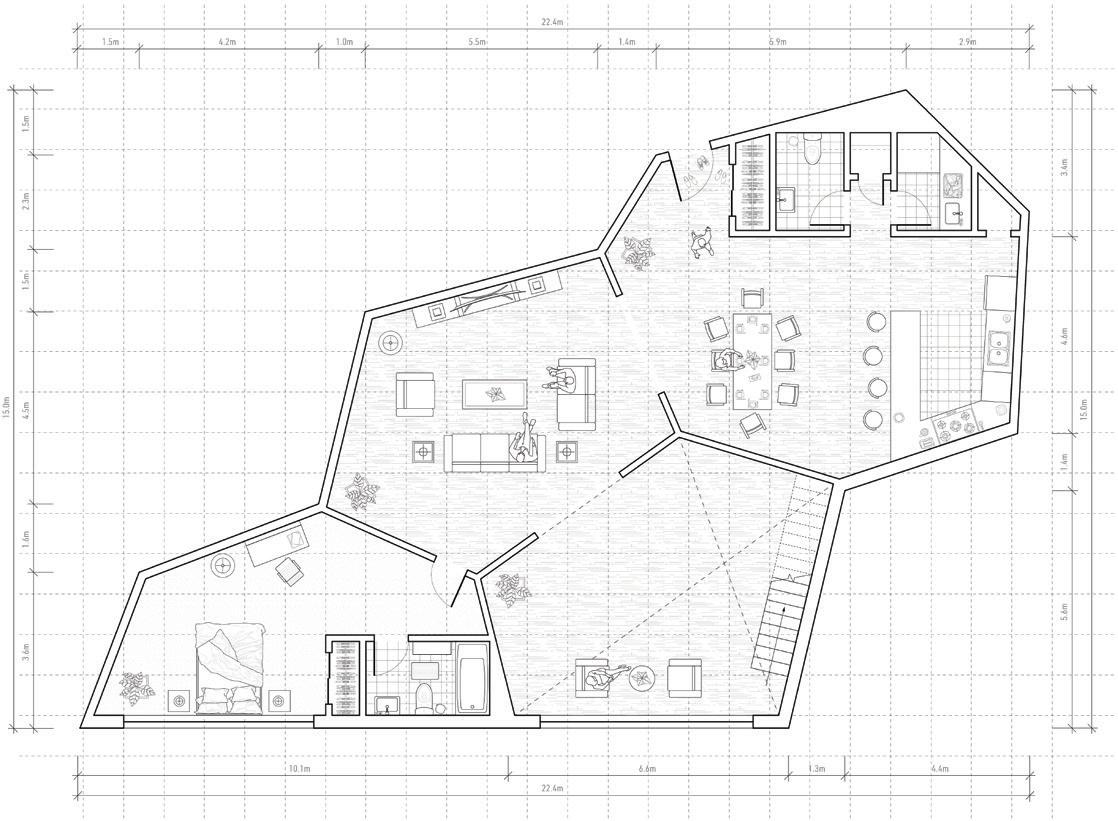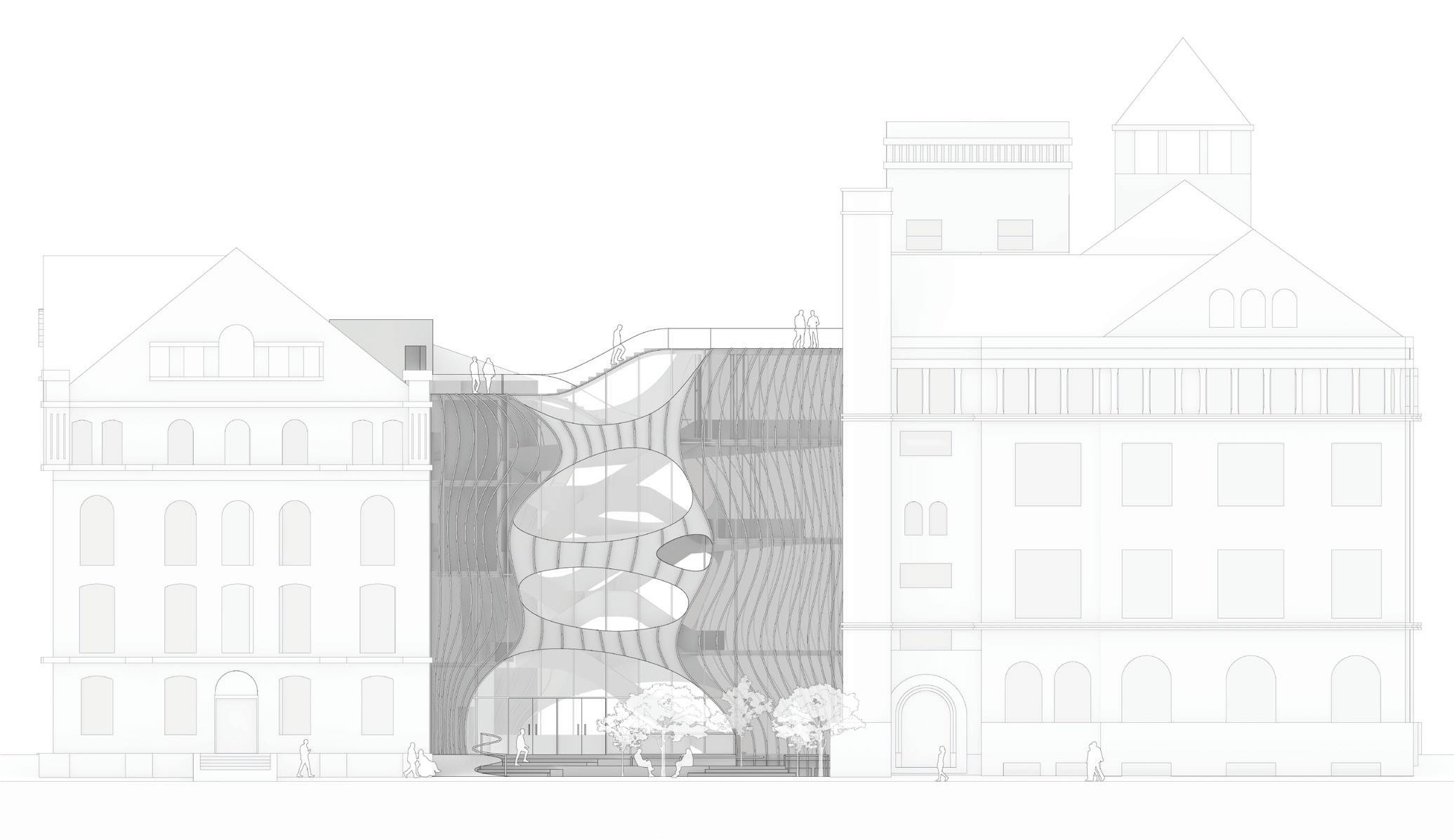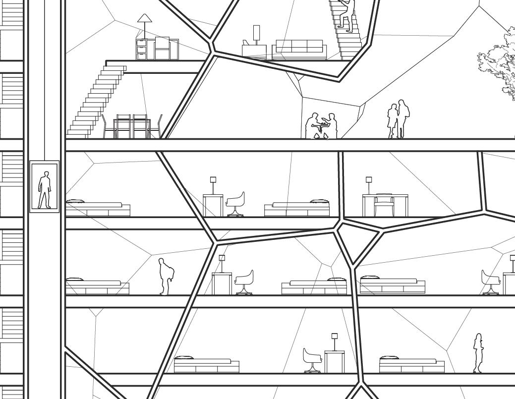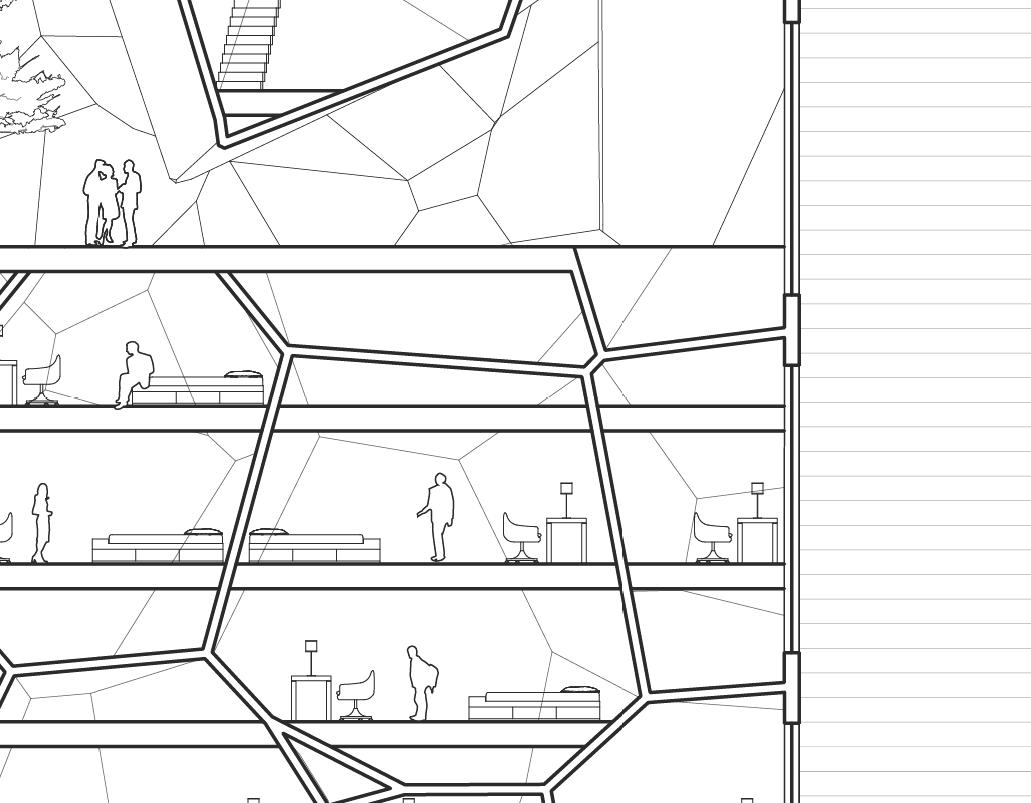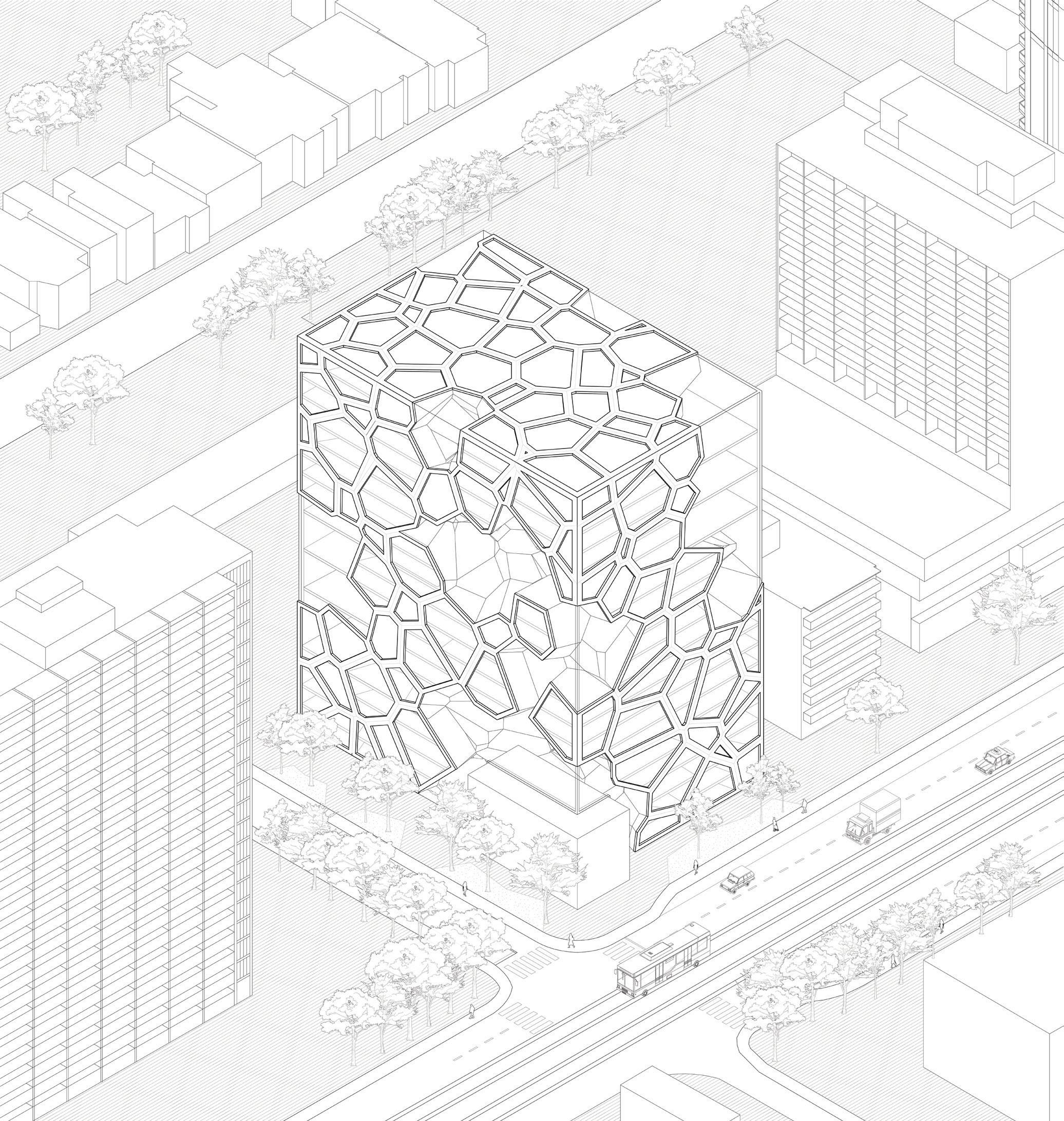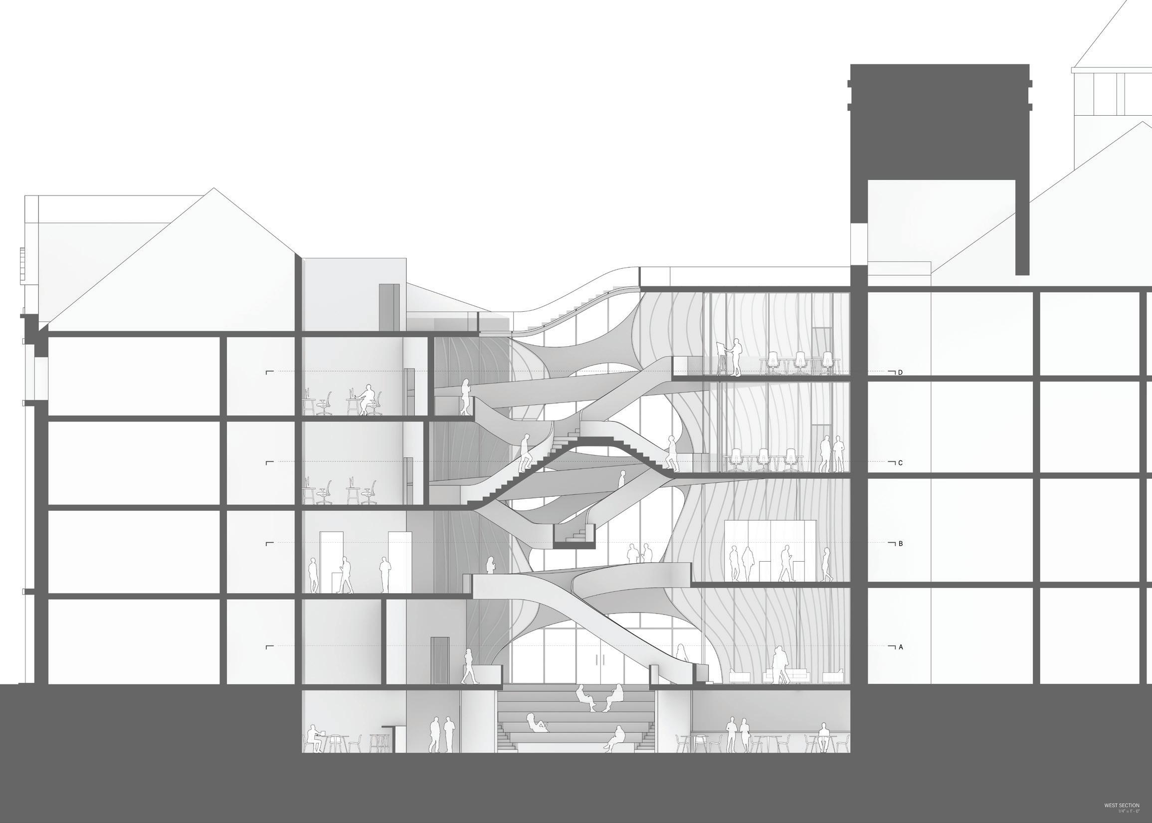 CONCEPT: This design was inspired by the texture of a sticky substance, suggesting that the two adjacent buildings are stuck together both figuratively and literally. To bridge the disconnection between the two schools, a series of staircases and ramps were designed to seamlessly unite the faculties while maintaining the dissonance between the misaligned floor plates.