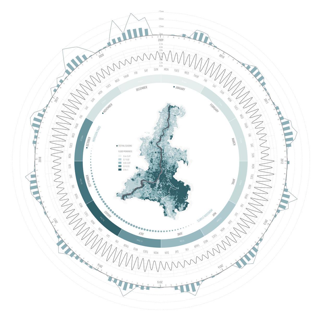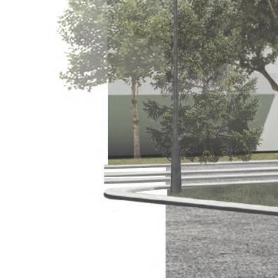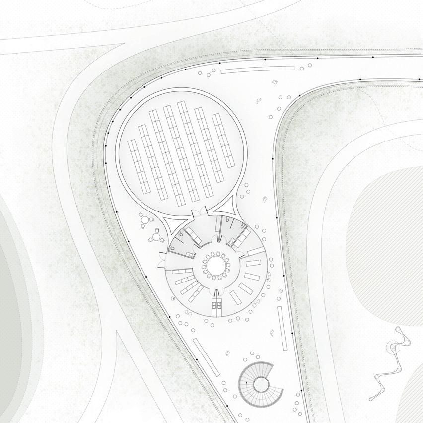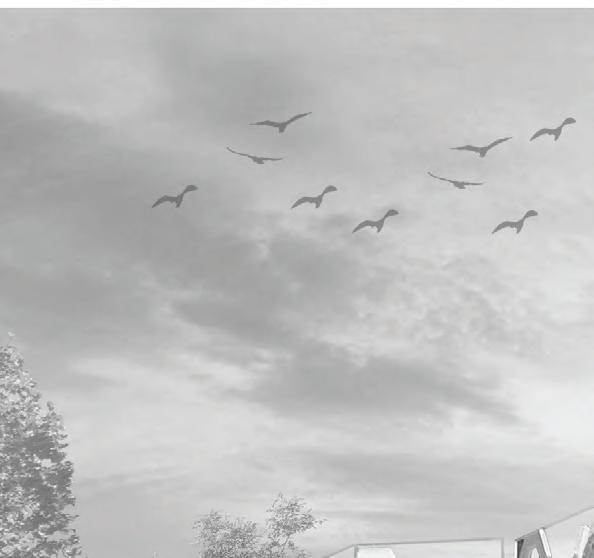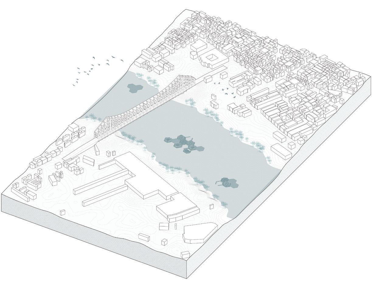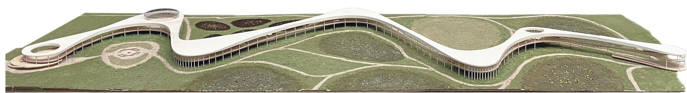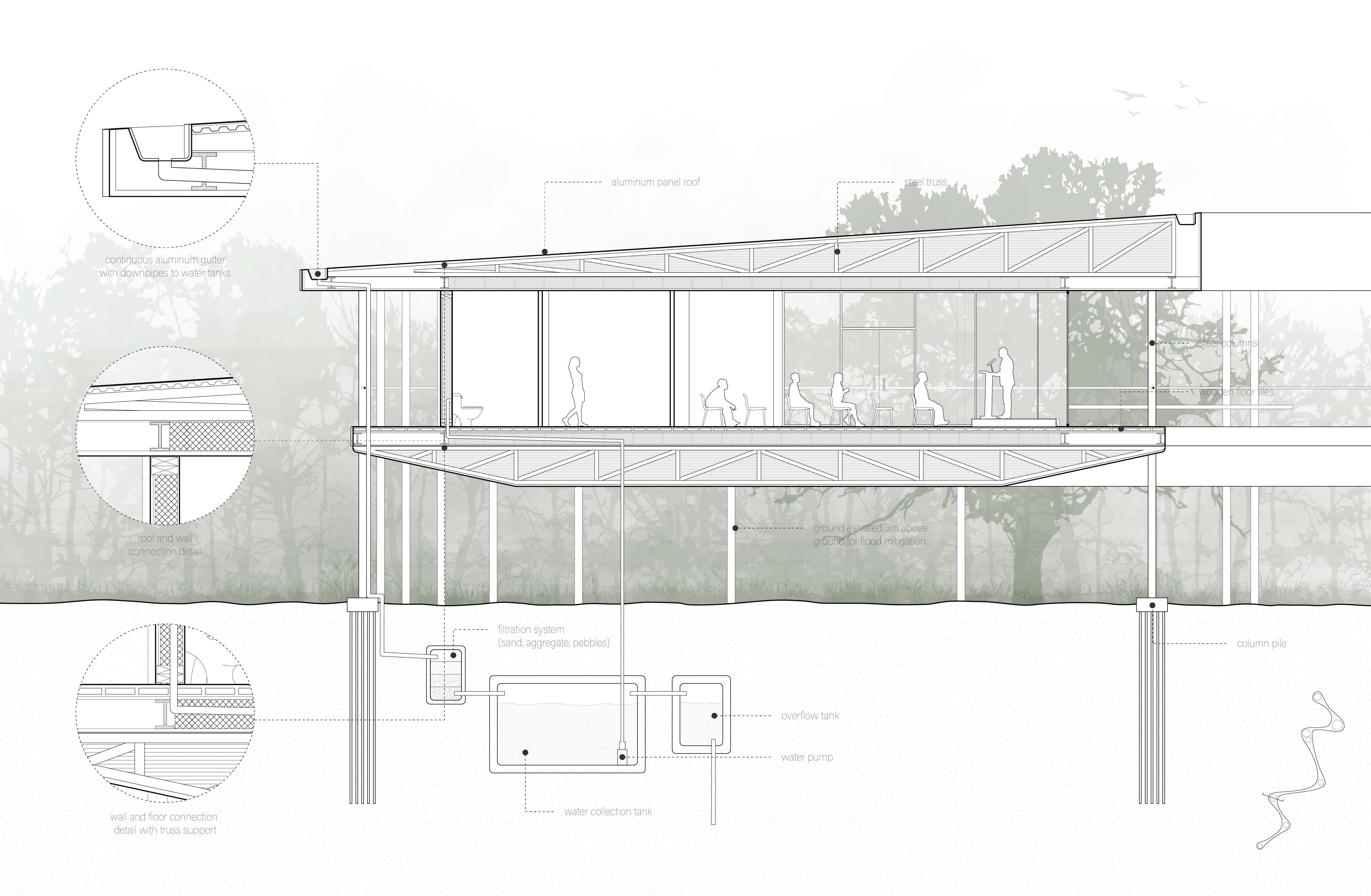 LANDSCAPE INTERVENTION: Since the site is prone to flooding, the building is elevated above the ground and a series of wetlands are introduced to productively mitigate the water. The wetlands are shaped by the curvature of the building and also provides habitats for wildlife. Additionally, outdoor gathering spaces are implemented on the site including an intimate gathering circle and a large grass field for outdoor social activities.