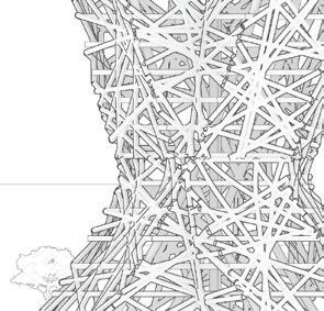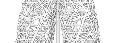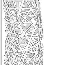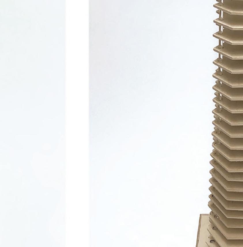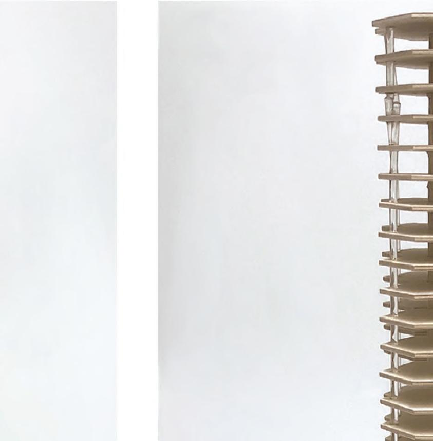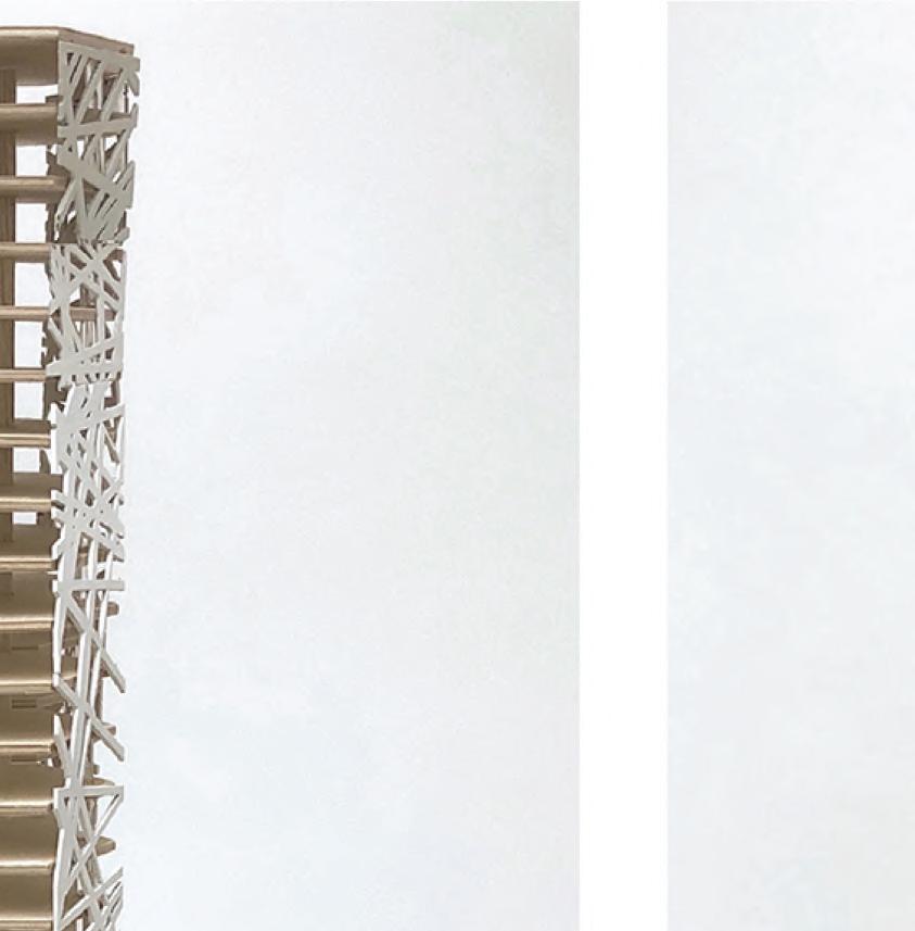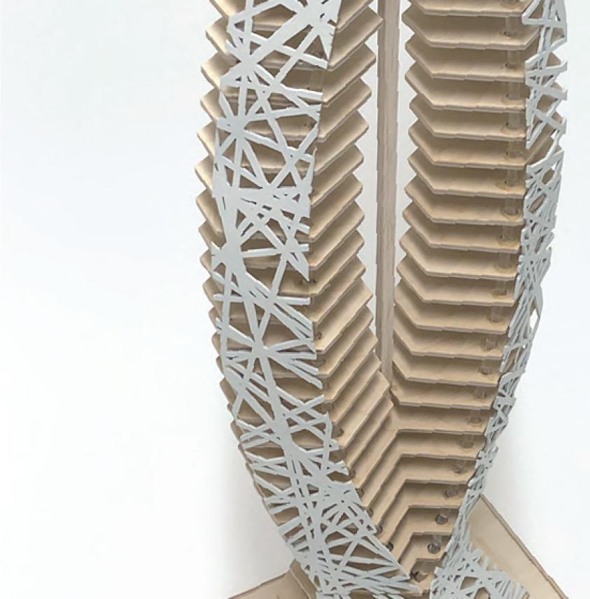 Challenging the structure of contemporary skyscrapers, this project demonstrates the capacity of parametric design and modelling. This forty storey parametric tower and its facade were created using Grasshopper and Rhinoceros. Inspired by the structure of a chromosome or a thread of DNA, the design of the tower is composed of two joined hexagonal shapes that gradually separate and join back together, creating two curved bodies. To further explore the theme of biological forms, the facade demonstrates an abstract take on the unique pattern of nerves and neurons. The model was built from laser-cut plywood floors that are supported by a central column and two acrylic rods on either side of the tower. By creating a sectional model, we were able to experience with different materials for the facade, such as laser cut millboard, thread, and 3D printed starch.